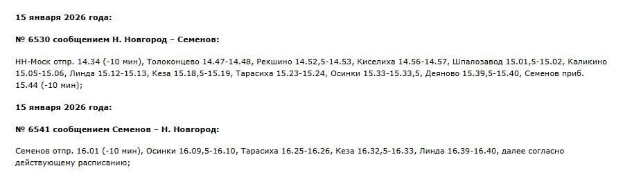 Так, изменения затронут электрички, курсирующие между Нижним Новгородом и Семеновым, № 6518 сообщением Н. Новгород — Семенов, № 6520, № 6530 и № 6541.