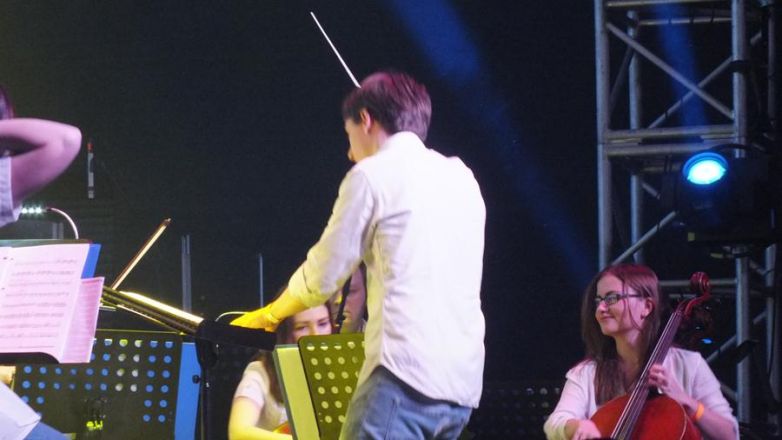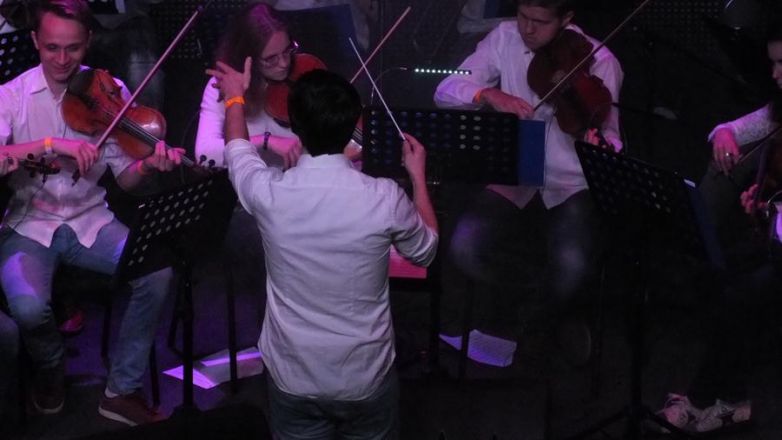 Дирижер Сергей Акимов с легкостью перечислил все музыкальные инструменты, которые использует оркестр — скрипки разных видов, флейты, контрабас, гобои, кларнет, фагот, валторны, труба, тромбон, бас-гитара, фортепиано, ударные. Позднее на сцене он, чуть подпрыгивая от переполняющих эмоций и драйва, руководил всеми этими инструментами, которые должны раскрыть собственное видение знакомых всем собравшимся мотивов.