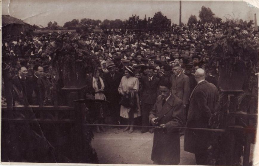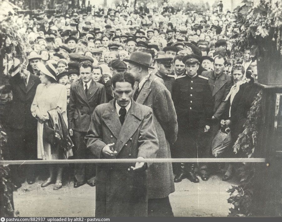 Открытие Государственного литературно-мемориального и природного музея-заповедника А.С.Пушкина. Правнук Г.Г. Пушкин перерезает ленту. 18 июня 1949. / pastvu.com; Капелюш Нисон Михайлович. «Болдино. Юбилейные торжества. 150 лет со дня рождения А.С.Пушкина. Открытие музея» / госкаталог.рф