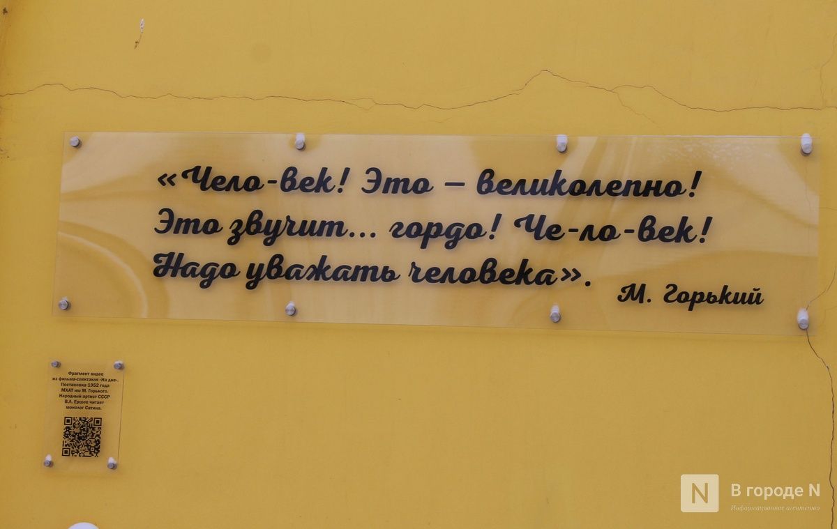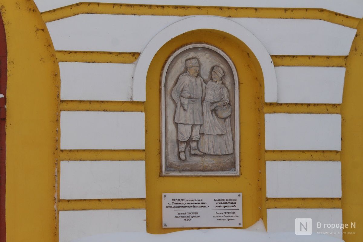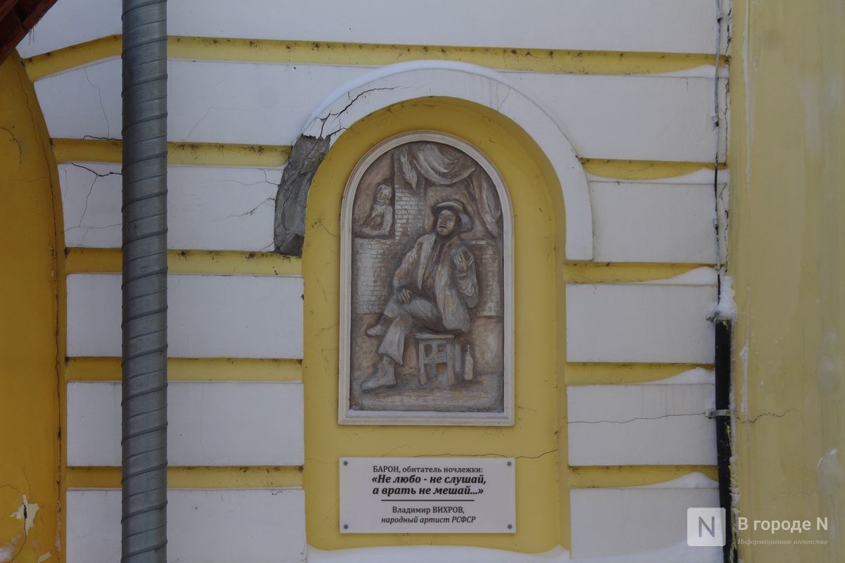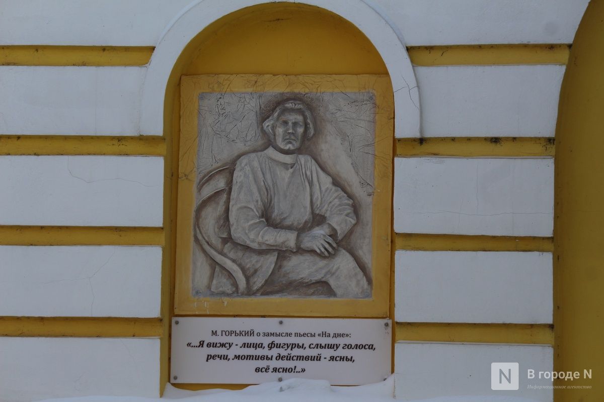 А на доме № 14 не так давно появились барельефы с героями пьесы «На дне» (16+) . На них изображены персонажи постановки 1967 года в исполнении актеров Нижегородского театра драмы. Галерею создала художник Елена Кручинина.