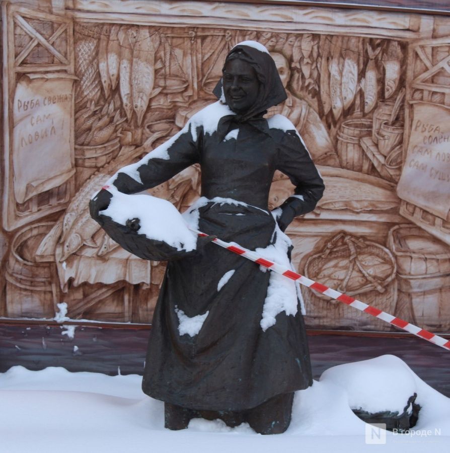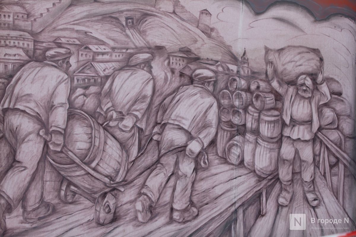 За спиной торговки находится панно «Рыбная лавка». Оно появилось совсем недавно — летом 2025 года. Картину нарисовал нижегородский художник Леонид Колосов. Автора вдохновила сама история этого места, где раньше были многочисленные торговые лавки, а неподалеку есть Рыбный переулок.