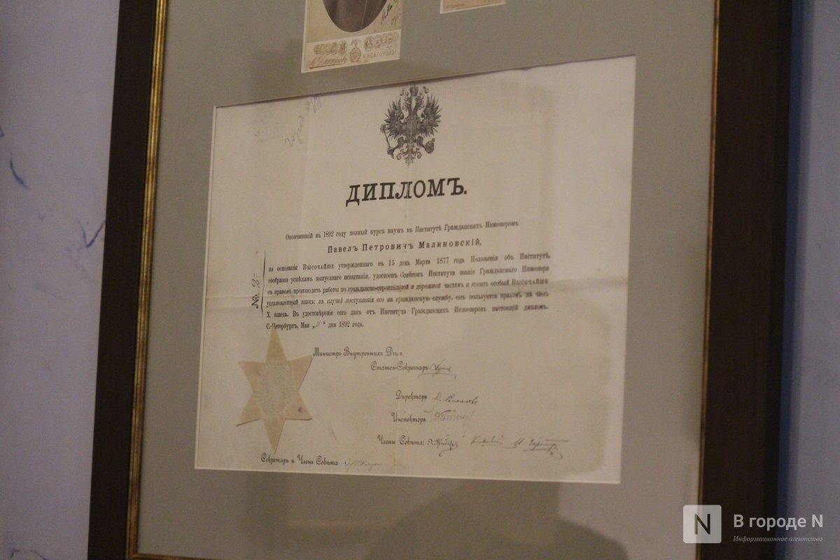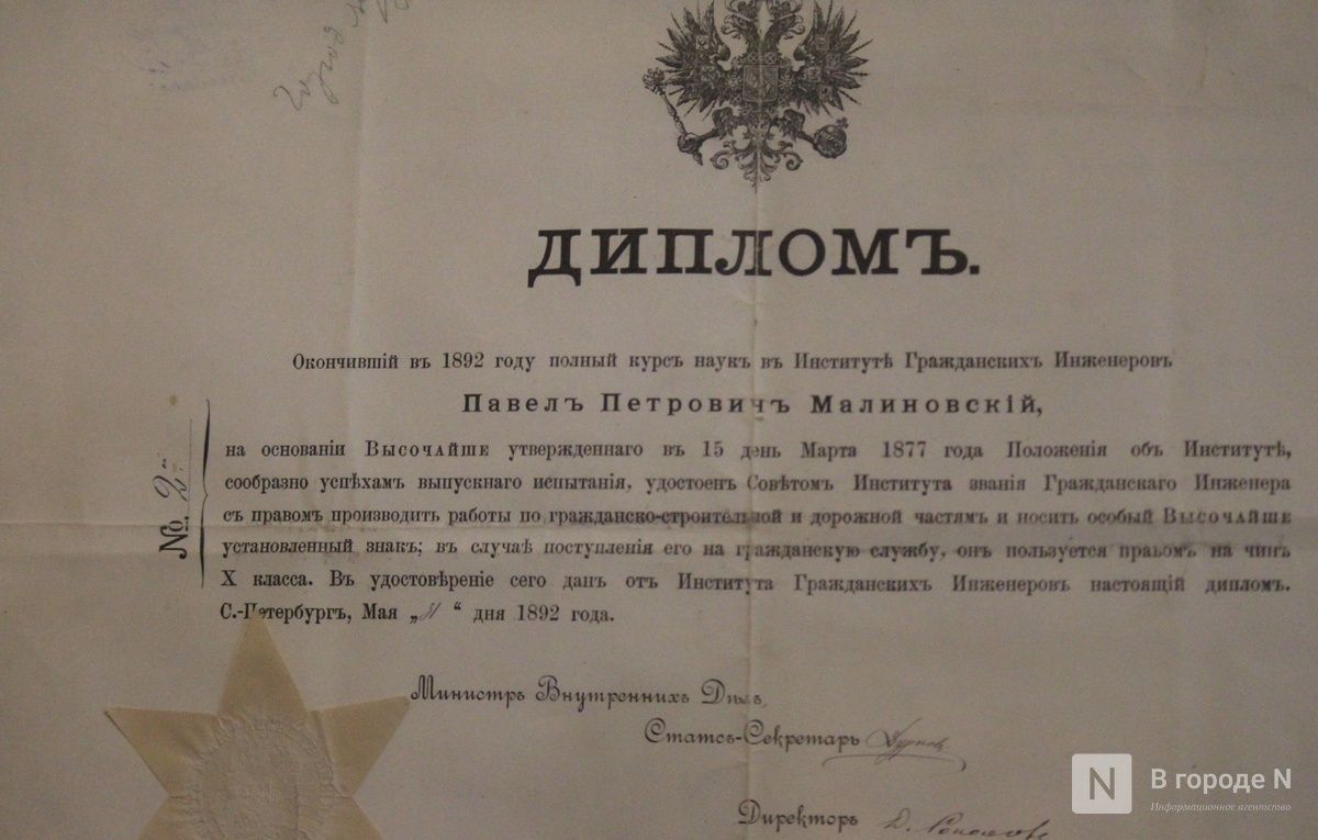Как рассказала куратор выставки, руководитель отдела истории НГИАМЗ Татьяна Кузьмина, Павел Малиновский родился в 1869 году в многодетной семье. Его отец работал писарем в губернской гимназии. Павлу пришлось с 12 лет помогать ему содержать большую семью. Затем он окончил училище, после чего уехал в Санкт-Петербург. Там будущий архитектор был принят в институт гражданских инженеров. На выставке представлен его диплом об окончании данного учебного заведения.
