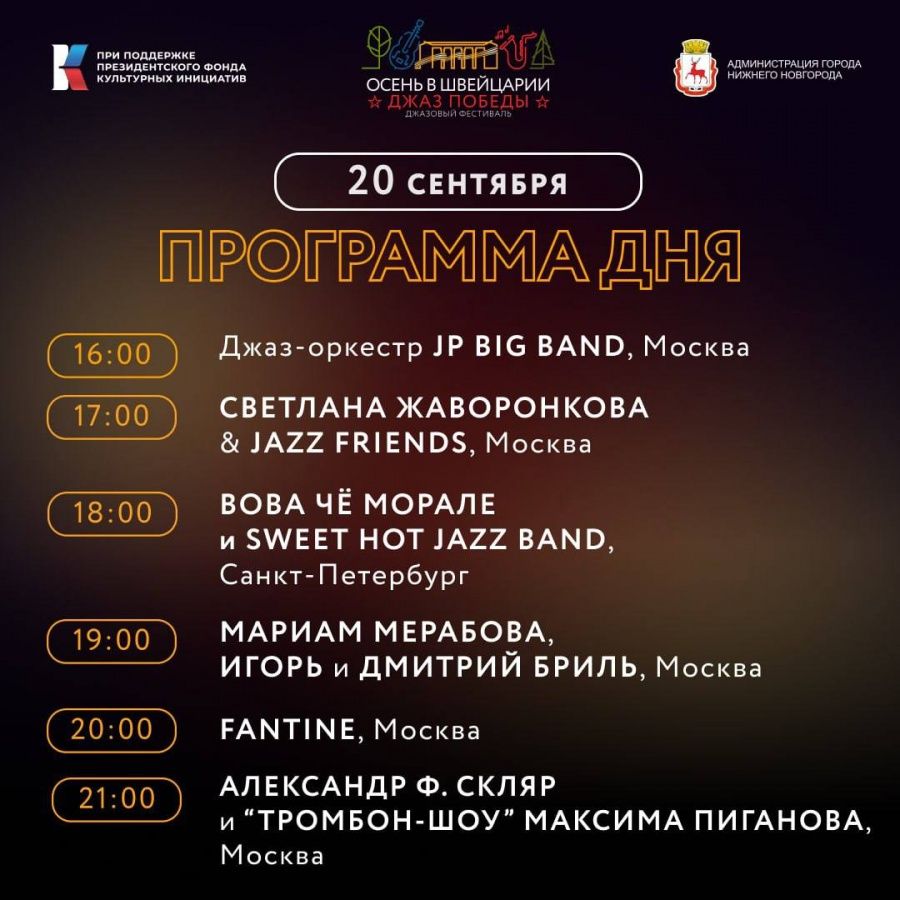 В субботу, 20 сентября, выступят московские и петербургские певцы и джаз-оркестры, Народный артист РФ Игорь Бриль, основатель и лидер рок-группы «Ва-Банкъ», Заслуженный артист РФ Александр Ф. Скляр и тромбон-шоу Максима Пиганова.