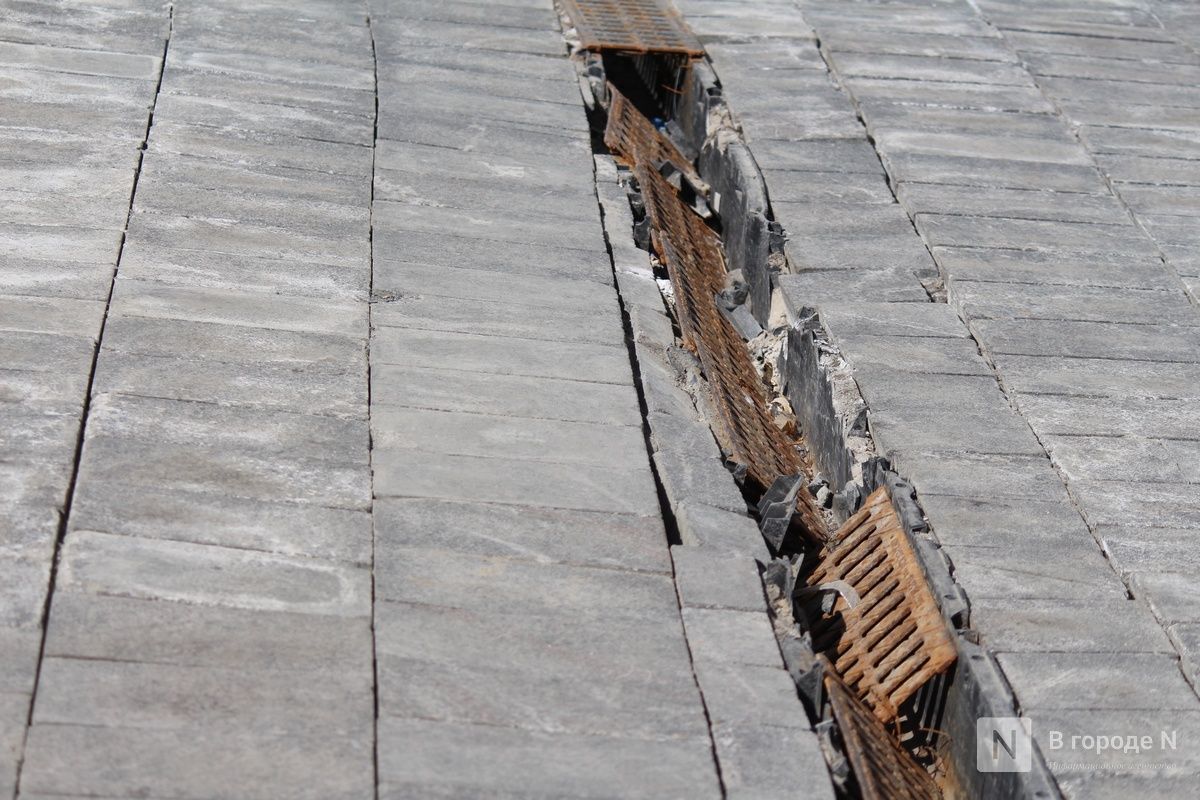Не в лучшем состоянии находится и брусчатка на Большой Покровской, особенно на участках около кинотеатра «Орленок» и филфака ННГУ. А рядом с площадью Минина и Пожарского покрытие вместе с решетками провалилось в желоб ливневки.