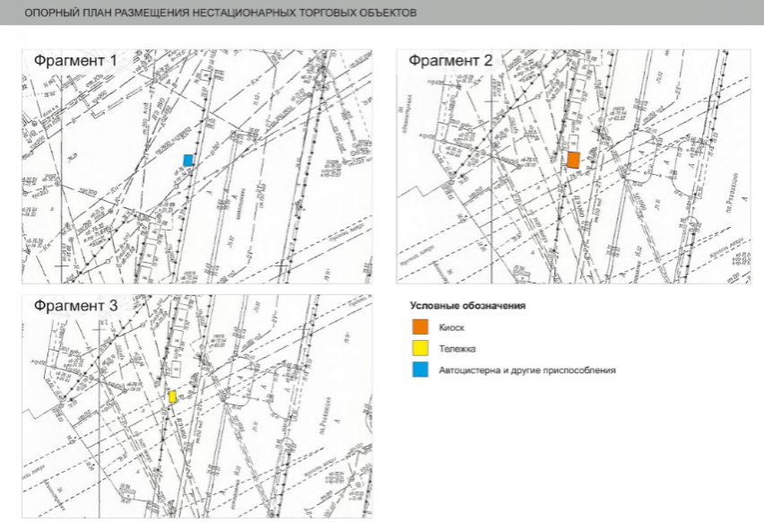 В частности, в проекте определяются возможные места расположения подобных сооружений и их виды. Концепцией предусмотрено только размещение киосков, тележек и автолавок.