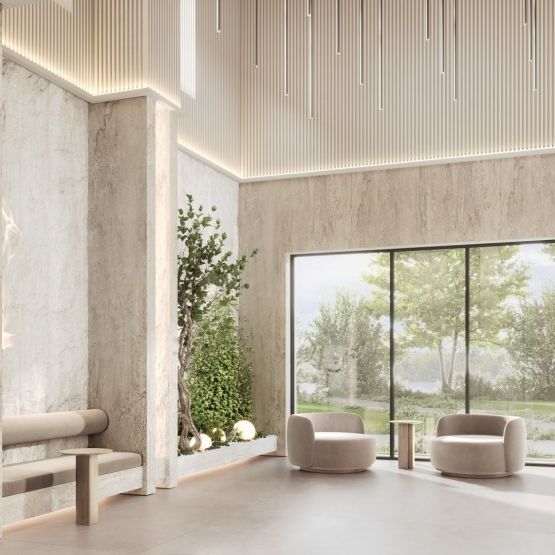 Каждый элемент дизайна выбран неслучайно, объясняют в GloraX. Натуральные материалы, такие как керамогранит и травертин, символизируют устойчивость, а стекло ассоциируется с чистотой. В интерьерах появятся фитокомпозиции из живых и декоративных растений, а атмосферу дополнят продуманная система освещения, мягкие световые акценты и теплая текстура мебели.