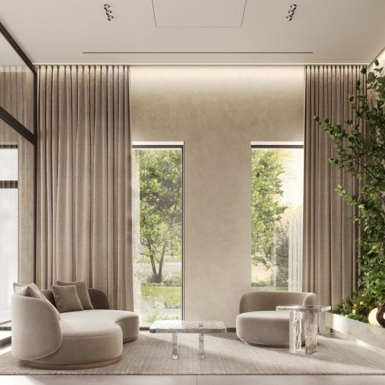 Гранд-лобби — сердце общественных пространств — будет занимать более 100 квадратных метров. Потолки высотой 6 метров и архитектурный прием «второго света» обеспечат ощущение простора и добавят больше естественного света. Здесь расположатся стойка ресепшн, зона ожидания, мягкая мебель и гостевой санузел, что особенно удобно для семей с детьми.