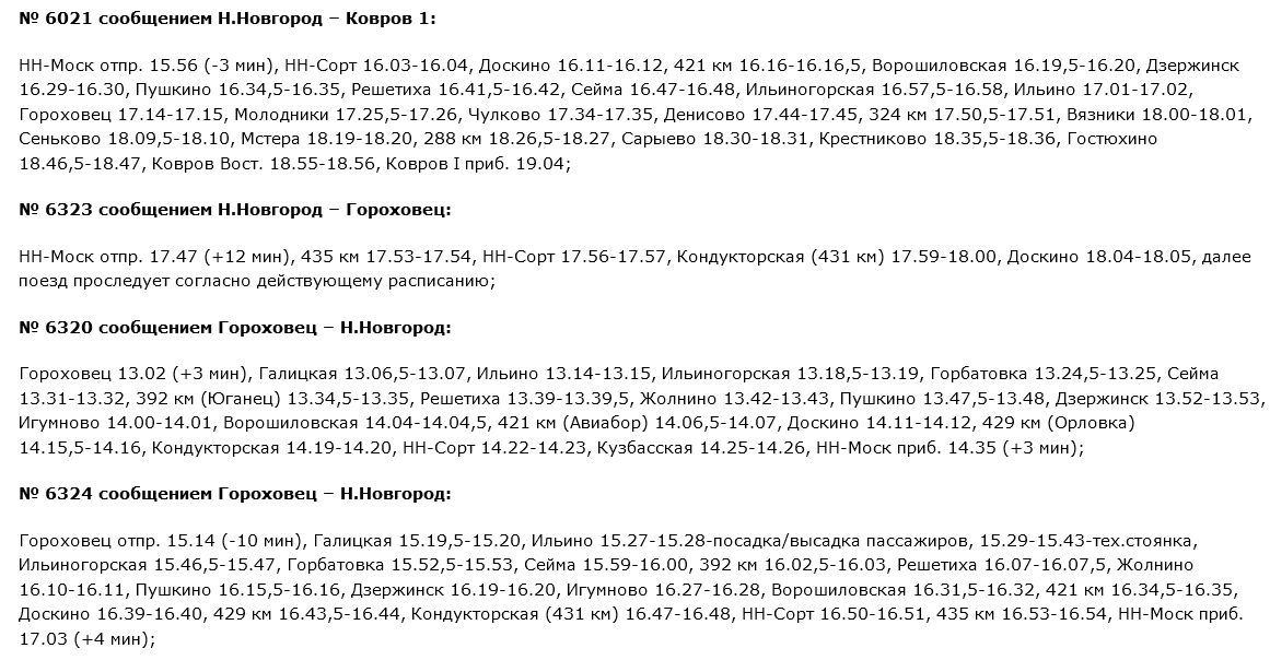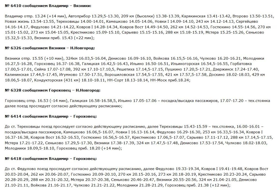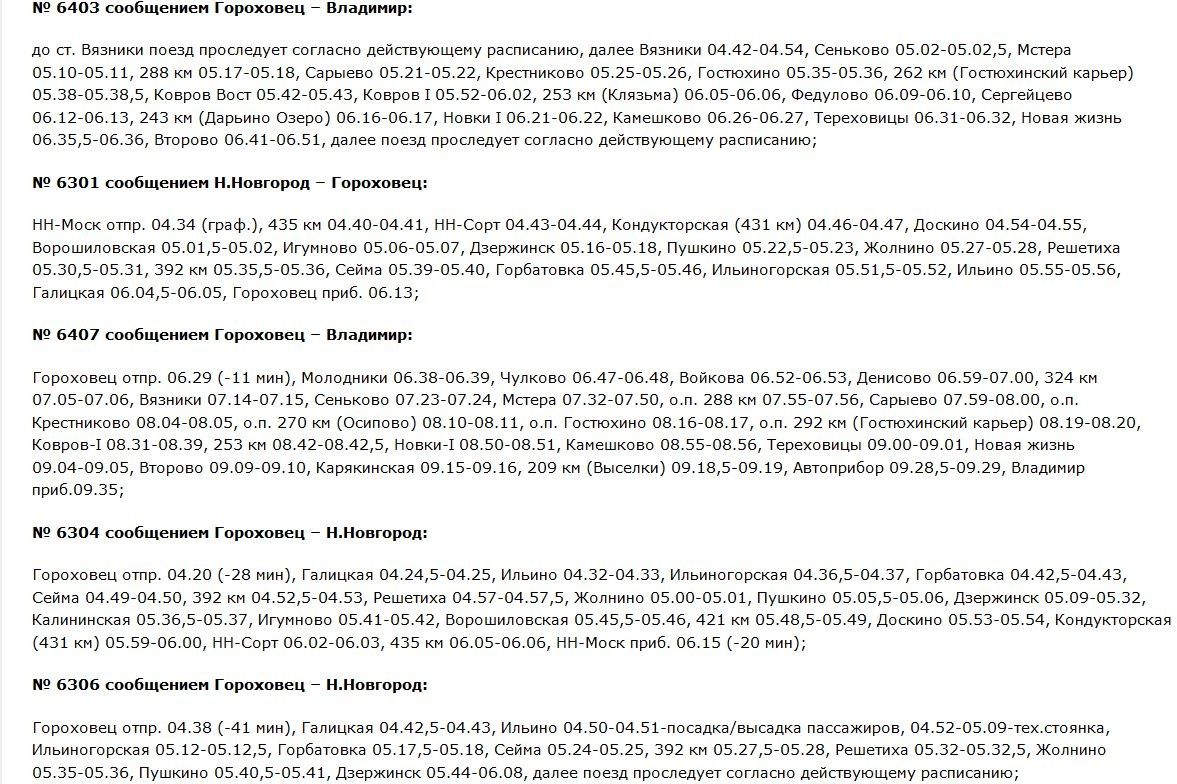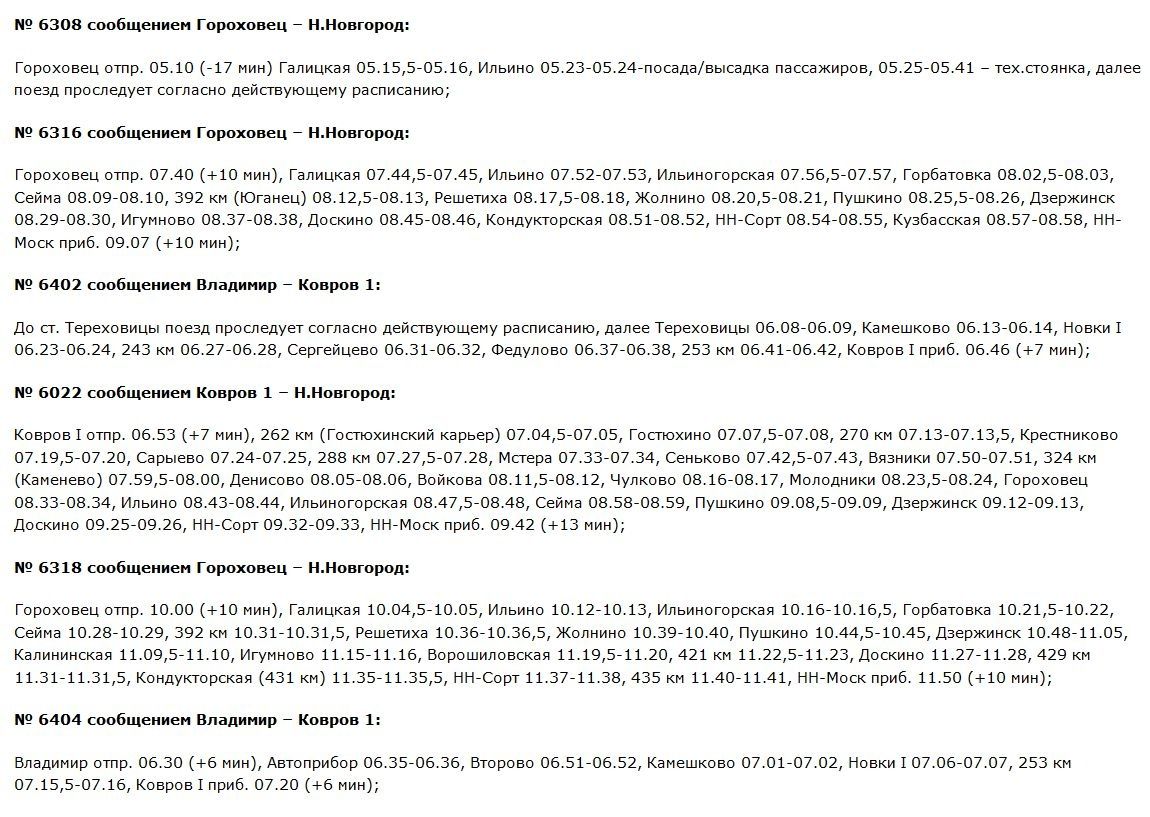 Изменения связаны с техническими причинами. Они коснутся электропоездов сообщением «Нижний Новгород — Гороховец», «Нижний Новгород — Ковров», «Нижний Новгород — Вязники», «„Моховые горы“ — проспект Гагарина» и «Нижний Новгород — „Мыза“». Подробное расписание можно найти в карточках: