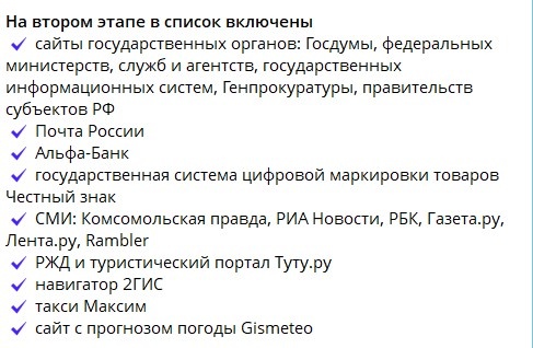 Так, на втором этапе в списке оказались банки, сайт с прогнозами погоды, сервисы для покупки билетов, некоторые СМИ, такси, сайты госорганов.