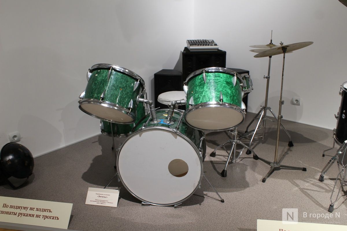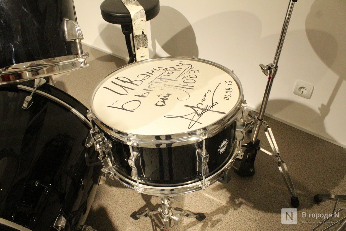 А вот барабан группы «Любэ» — подлинный. Музыканты подарили его коллекционеру Ивану Быстрову в 2016 году, о чем свидетельствует надпись. А позднее инструмент приобрели для нижегородского музея.