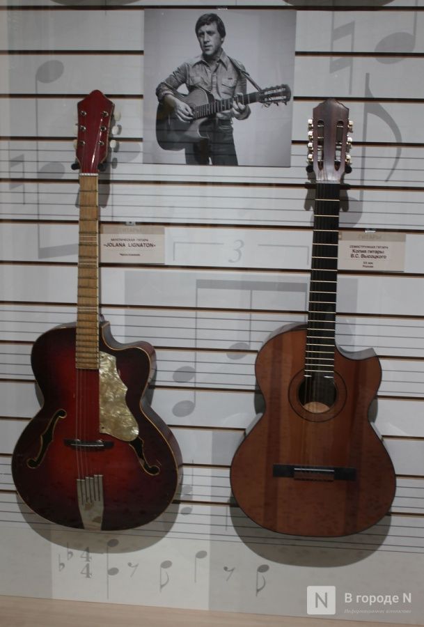 Здесь же представлена копия семиструнной гитары знаменитого барда Владимира Высоцкого. Ранее она экспонировалась в музее «Назад в СССР».