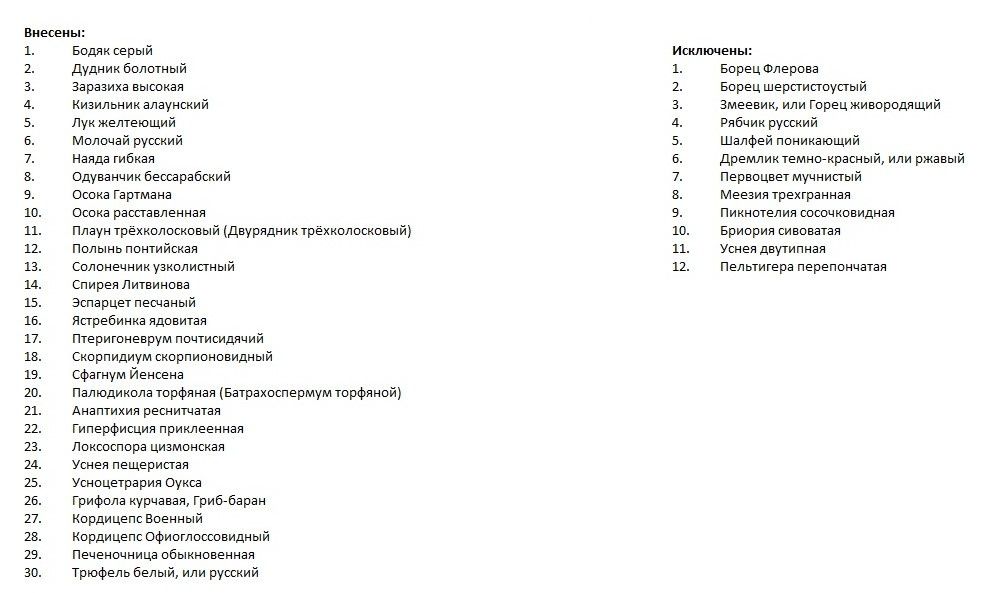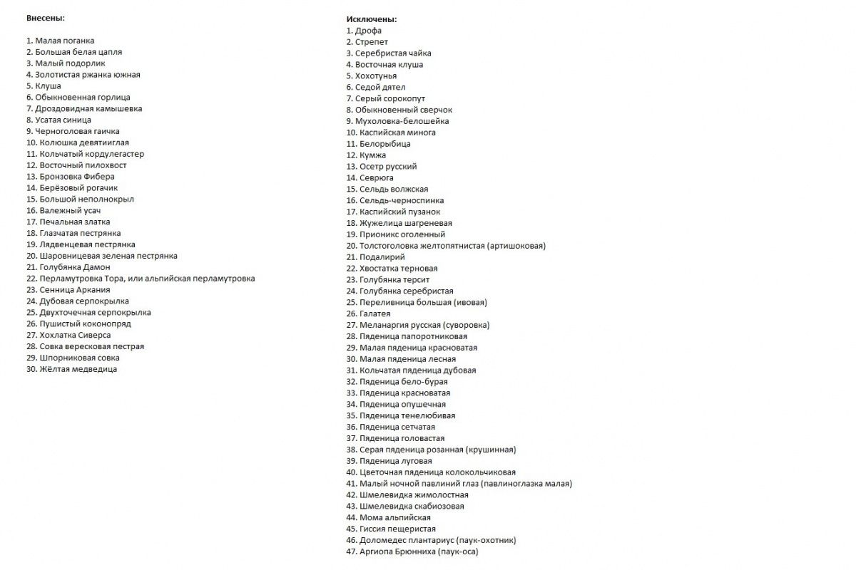 В список позвоночных и беспозвоночных животных включили 30 новых видов животных, а исключили — 47. В перечень растений специалисты внесли 30 новых видов, а убрали из него 12.