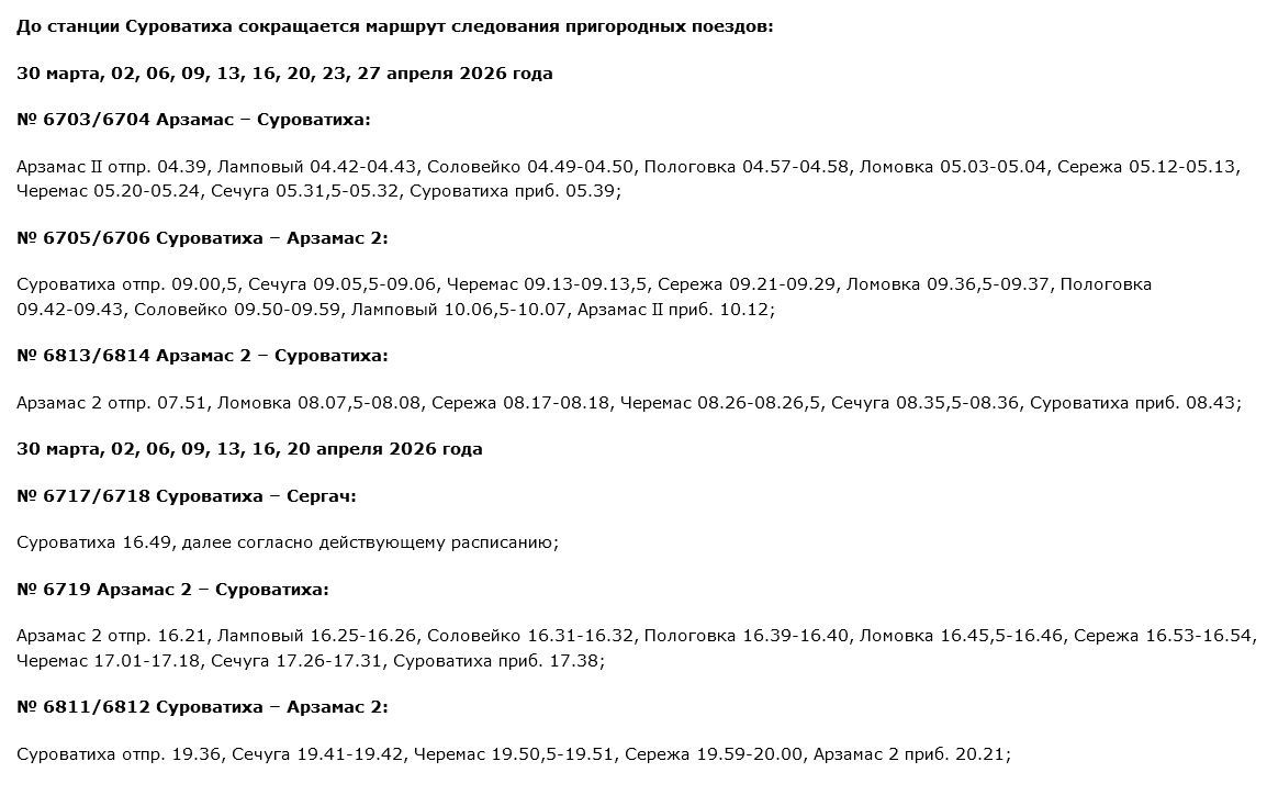 Кроме того, маршруты некоторых электропоездов из Арзамаса и Сергача будут сокращены до станции Суроватиха. Более подробную информацию можно найти в карточках ниже: