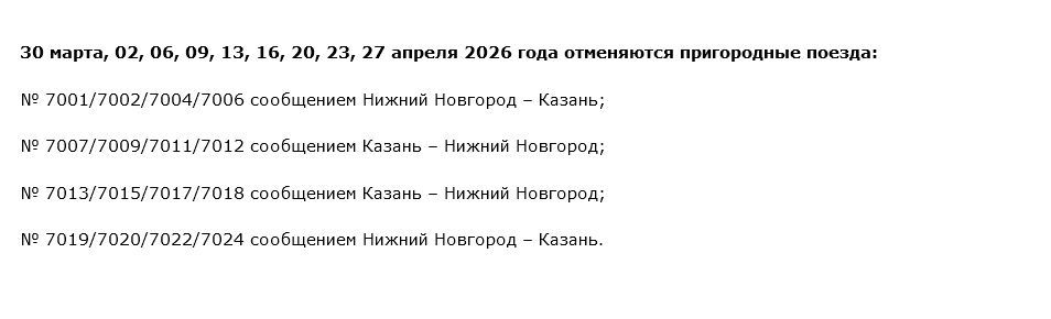 В частности, в отдельные дни будут отменены электрички, курсирующие между нижним Новгородом и Казанью. Речь идет о поездах № 7001/7002/7004/7006, 7007/7009/7011/7012, 7013/7015/7017/7018 и 7019/7020/7022/7024. Они не будут ходить 30 марта, 2, 6, 9, 13, 16, 20, 23 и 27 апреля.