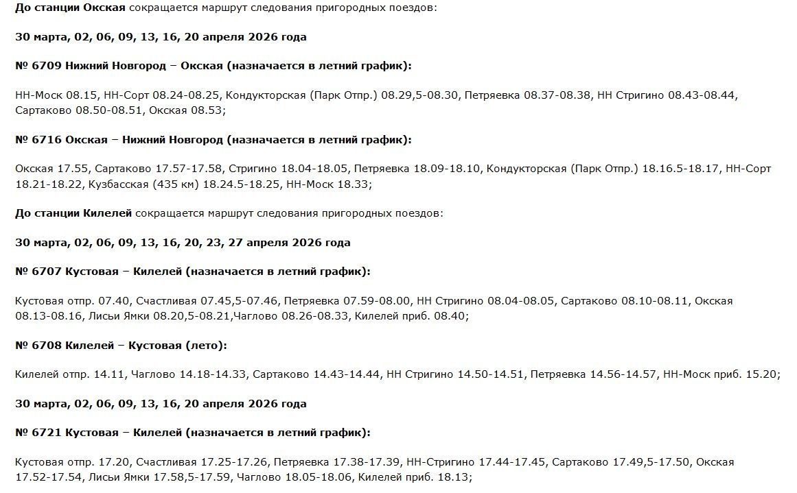 Расписание ряда электричек изменится в Нижегородской области в марте — апреле 2026 года. Об этом сообщает Волго-Вятская пригородная пассажирская компания.