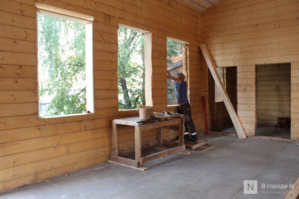 Деревянная часть — непосредственно дом Чардымова — станет кухней для приготовления блюд. Отделки и декора там пока нет — элементы поступят позднее. Резьбу изготавливают мастера из Вологды.