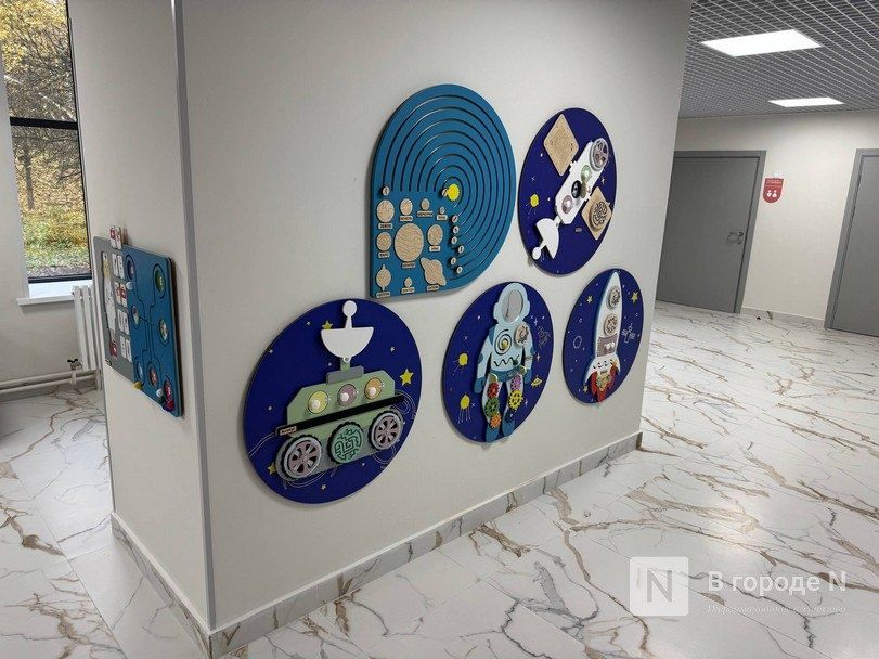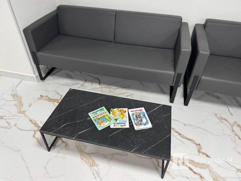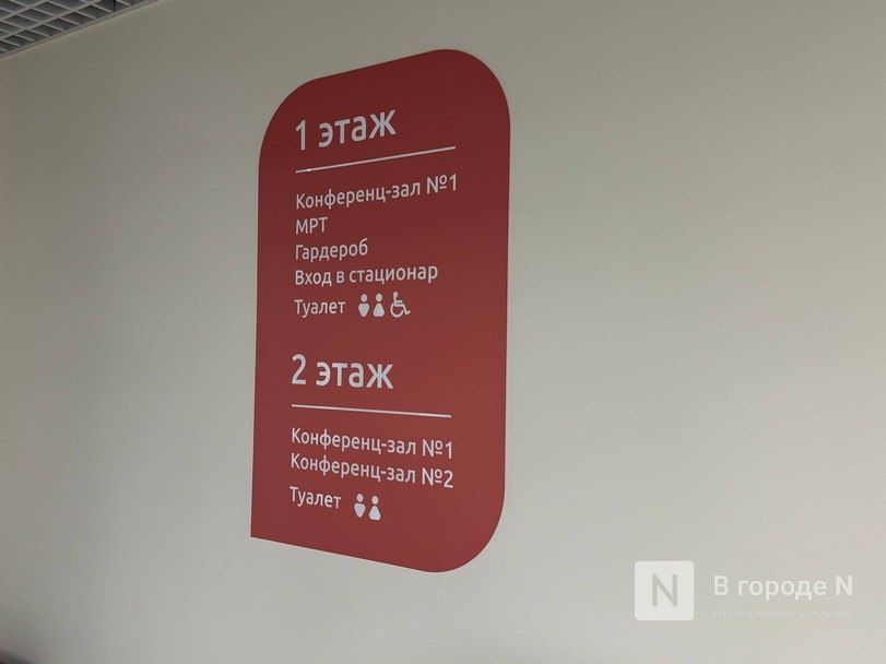 Здание встречает маленьких пациентов и их родителей светлым и просторным фойе. У стойки информации есть план корпуса: на первом этаже расположились вход в стационар, гардероб, туалеты, в том числе для людей с ограниченными возможностями здоровья, и кабинет МРТ. На втором этаже можно найти два конференц-зала и санузлы. На стенах уже установлены развивающие игры для детей, на столах лежат миниатюрные книжки.