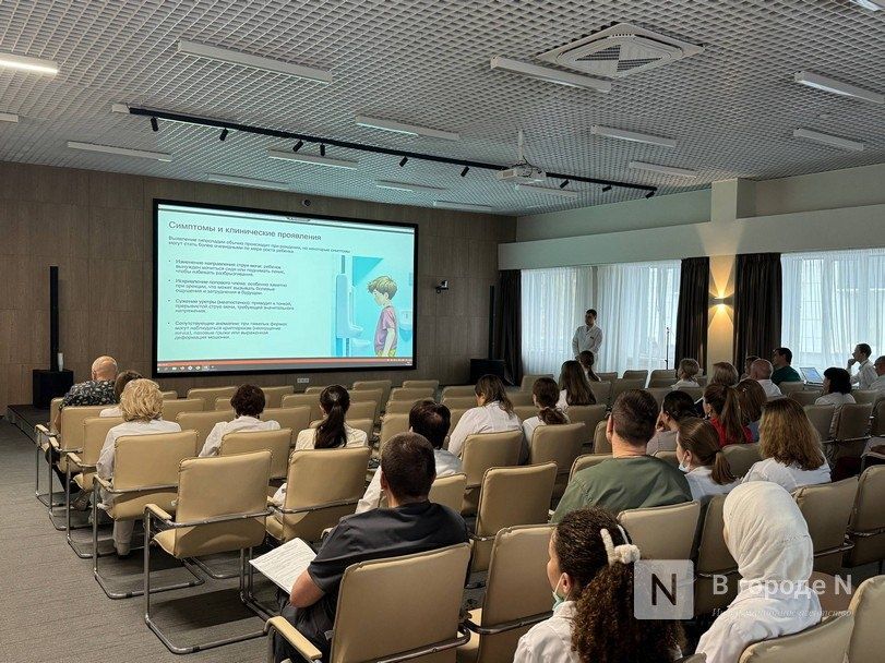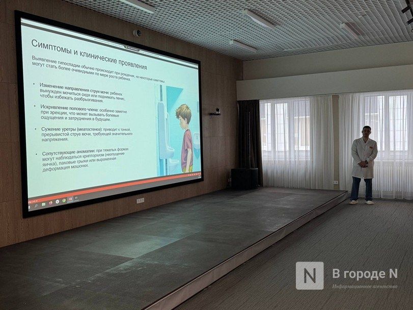 Не менее важная часть лечебно-диагностического корпуса находится на втором этаже — два конференц-зала. Первый или малый зал предназначен для обучающих лекций, которые проводятся раз в 1–2 недели для сотрудников НОДКБ. Кроме того, здесь организованы трансляции мероприятий для специалистов районных и городских больниц региона. Сегодня состоялась первая лекция, посвященная заболеваниям мочеполовой системы у детей. Ее проводит известный нижегородский уролог Артур Тибилов.
