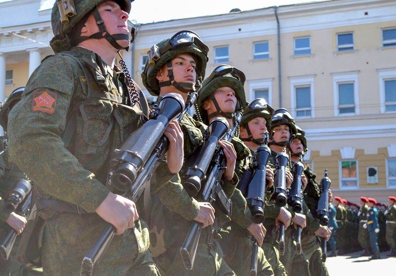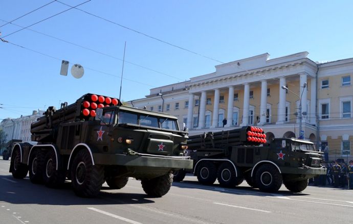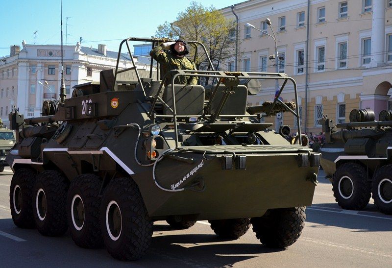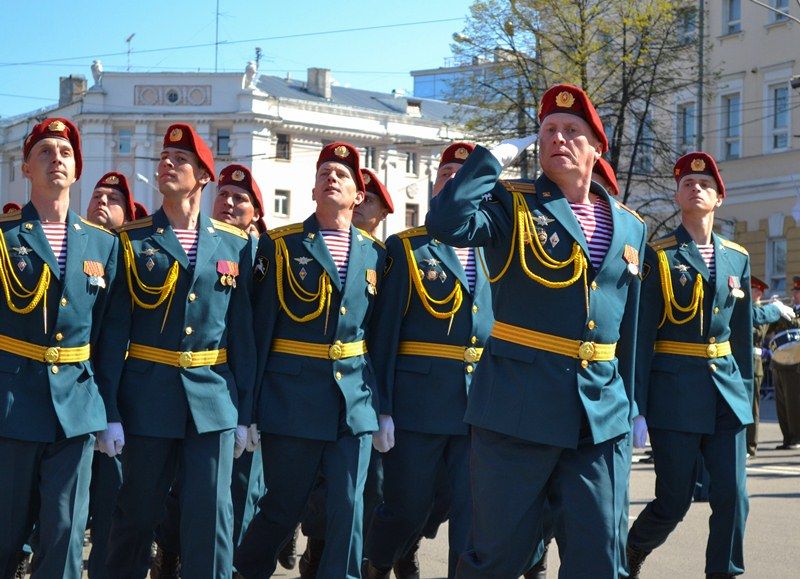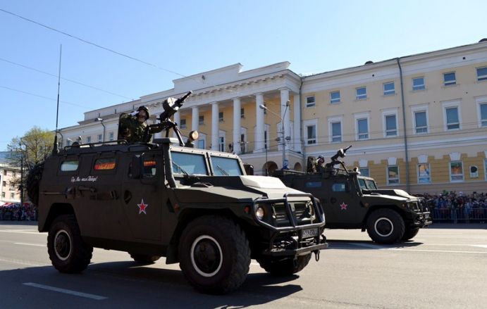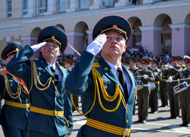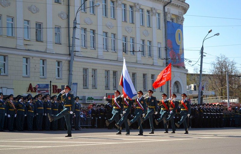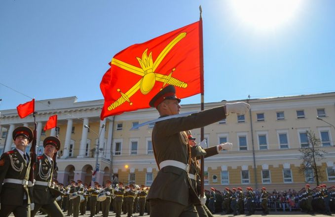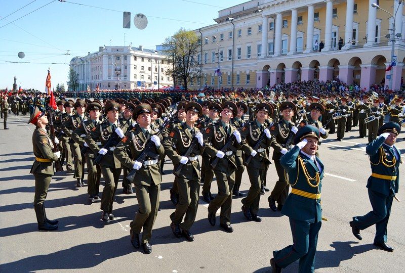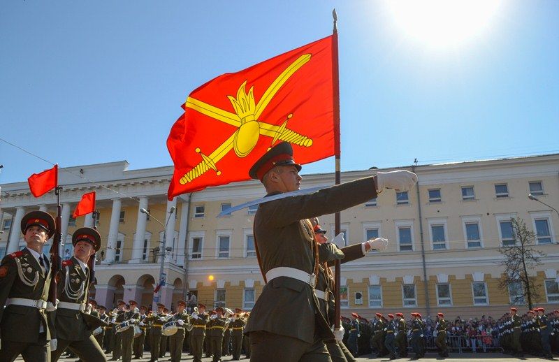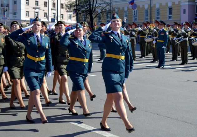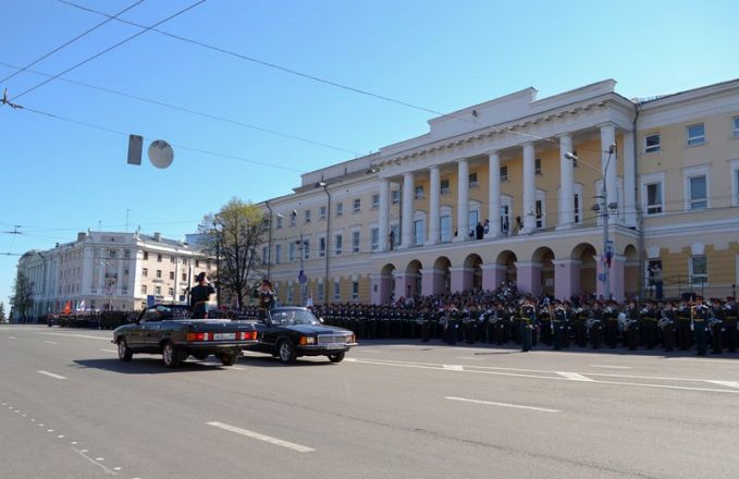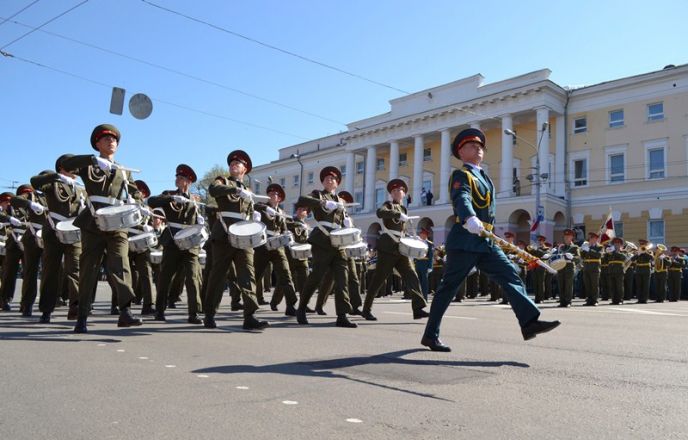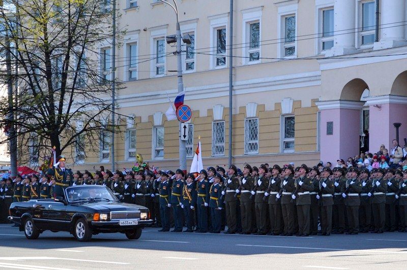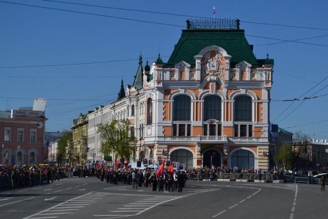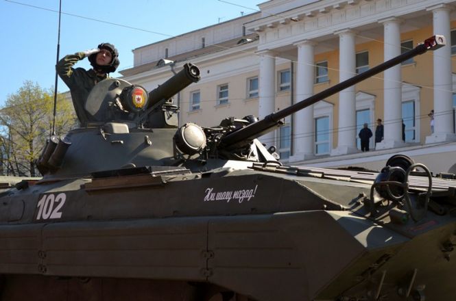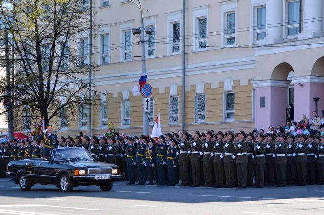 Именно здесь в 10 часов утра начался парад Победы, в котором приняли участие 1 100 военнослужащих. Открытием праздника стало шествие от Театральной площади, которое возглавили ветераны Великой Отечественной войны родом из города Горького. Далее по площади прошли парадные расчеты: подразделения мотострелкового и артиллерийского соединений, бригады управления и материально-технического обеспечения и парадные расчеты танковой бригады, дислоцирующиеся в Мулино. Кроме того, на глазах у нижегородцев по главной городской площади прошли боевые машины, стоящие на вооружении российской армии: танки Т-72Б3, бронетранспортеры БТР-80, реактивные системы залпового огня «Град» и «Ураган», бронеавтомобили спецназначения «Тигр», боевые машины пехоты БМП-2, противотанковые пушки «Рапира» и минометы «Сани». Отметим, что на каждую из единиц военной техники, присутствовавших на параде, были нанесены реальные лозунги времен Великой Отечественной войны.