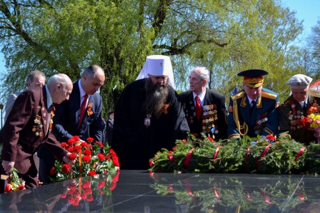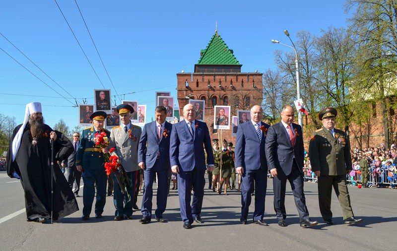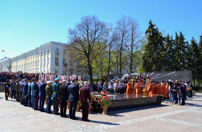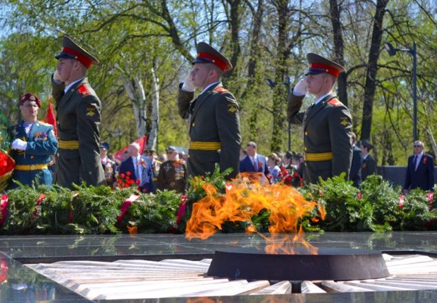 Далее участники праздника традиционно переместились к Вечному огню, где митрополит Нижегородский и Арзамасский Георгий прочел молитву о воинах, погибших в годы войны. После этого горожане во главе с губернатором Валерием Шанцевым, главой Нижнего Новгорода Олегом Сорокиным и градоначальником Олегом Кондрашовым возложили к мемориалу цветы в память о павших героях.