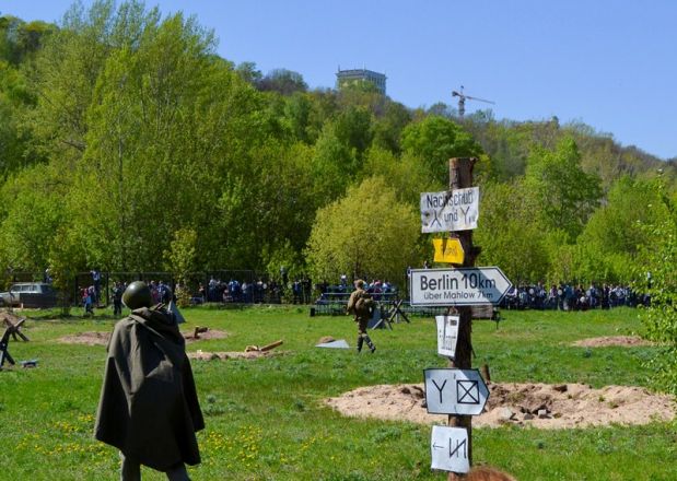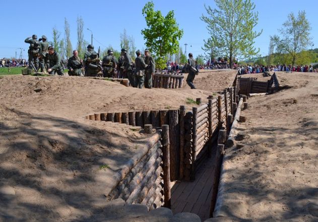 В 13 часов празднование 9 мая открылись в парке Победы на Гребном канале, где уже этим летом появятся четыре новых образца военной техники. В этот день в парке побывали около 10 тысяч нижегородцев. Главным событием здесь стала реконструкция боя на подступах к Берлину, которую продемонстрировали гостям участники военно-исторических клубов Нижегородской области.