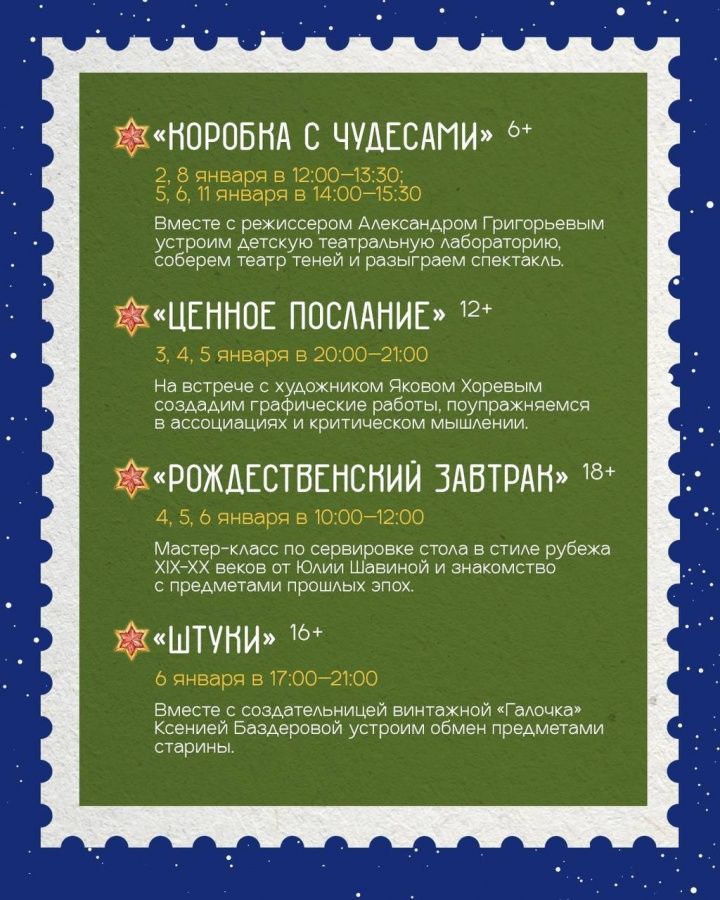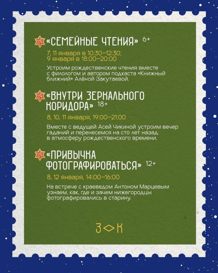 Серия встреч «Календарь дома. До и после Рождества» порадует нижегородцев и гостей города светлой и уютной атмосферой январских праздников. Мастер-классы по изготовлению елочных игрушек и зеркал, литературные чтения, вечера гаданий и рождественский ужин по всем правилам нижегородской старины — все это подготовили «Заповедные кварталы».