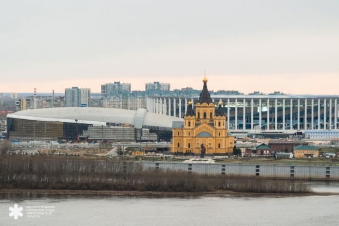 Панели фасада монтируют на строящейся Ледовой арене на Стрелке. Свежими кадрами поделился Институт развития городской среды Нижегородской области.