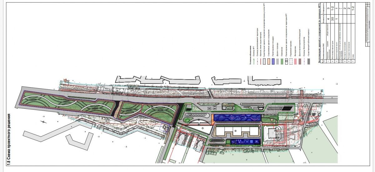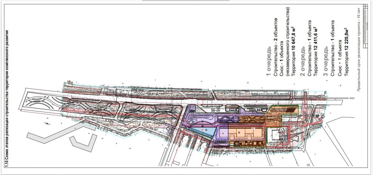 Застройку предполагается вести в три очереди, где в первую и вторую возведут многоквартирные дома, диспетчерский пункт, сквер и остановки. В рамках третьей очереди будет построен торговый центр. На первом этаже которого разместится продуктовый супермаркет и кафе, на втором этаже — фуд-корт, а также ресторан с террасой на кровле в верхней части здания. На 3-4 этажах предполагаются торговые ряды.