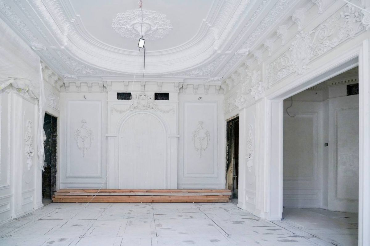 В Белом зале уже полностью восстановили гипсовую лепнину. Также во всех помещениях выполнена подготовка стен к покраске, проведены коммуникации. На следующем этапе работники будут укладывать паркет и благоустраивать территорию.