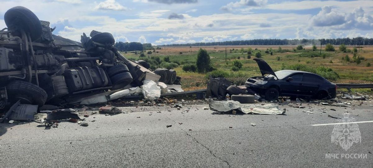 В результате ДТП отечественный грузовик опрокинулся в кювет, а японская иномарка загорелась. Погиб водитель «КамАЗа», еще три человека получили травмы.