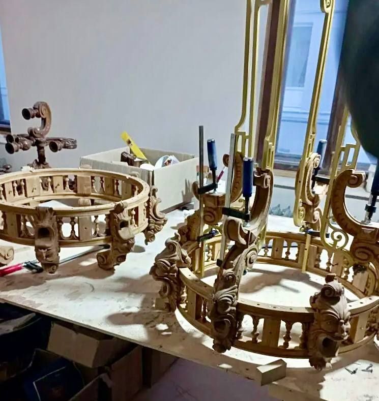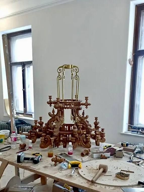 Реставраторы поделились кадрами изнутри. Работы в Дубовом зале уже почти закончены, собрана первая дубовая люстра. Восстановление лепнины выполнено на 94%, в такой же степени готовности находятся и новые отливы на фасаде здания.