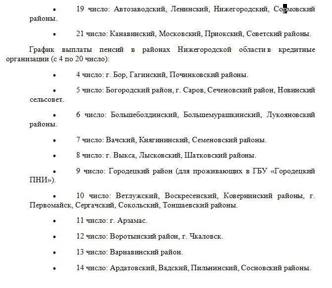 В частности, пенсии жителям Автозаводского, Ленинского, Нижегородского и Сормовского районов будут начисляться 19-го числа каждого месяца, а жителям Канавинского, Советского, Московского и Приокского — 21-го. Даты для округов области можно найти в карточках: