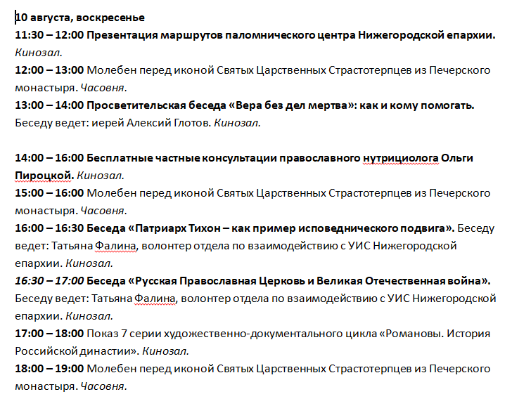 В первом павильоне Нижегородской ярмарки будут представлены иконы, церковная утварь, лампадное масло, продукция духовно-нравственного содержания, ювелирные изделия, бижутерия, одежда, обувь, постельное белье, ортопедические подушки, косметика. Здесь же можно будет подать требы в отдаленные обители.