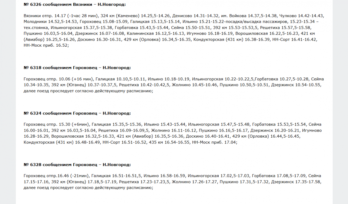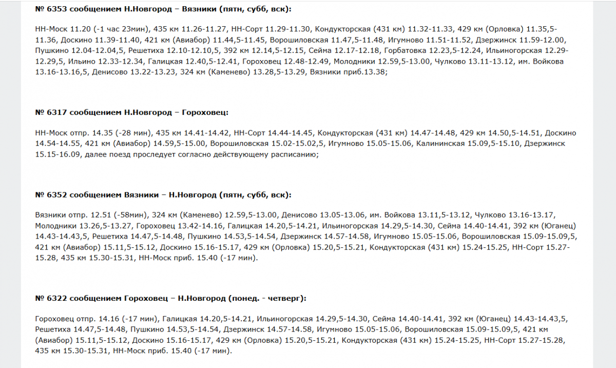 Также изменится время отправления составов № 6309 Н.Новгород — Вязники, № 6313 Н.Новгород — Гороховец (понед. — четверг), № 6353 Н.Новгород — Вязники (пятн, субб, вск), № 6317 Н.Новгород — Гороховец, № 6352 Вязники — Н.Новгород (пятн, субб, вск), № 6322 Гороховец — Н.Новгород (понед. — четверг), № 6326 Вязники — Н.Новгород, № 6318 Гороховец — Н.Новгород, № 6324 Гороховец — Н.Новгород, № 6328 Гороховец — Н.Новгород, № 7093 Н.Новгород — Ужовка.