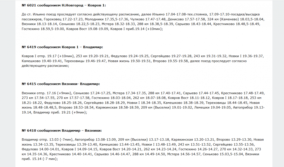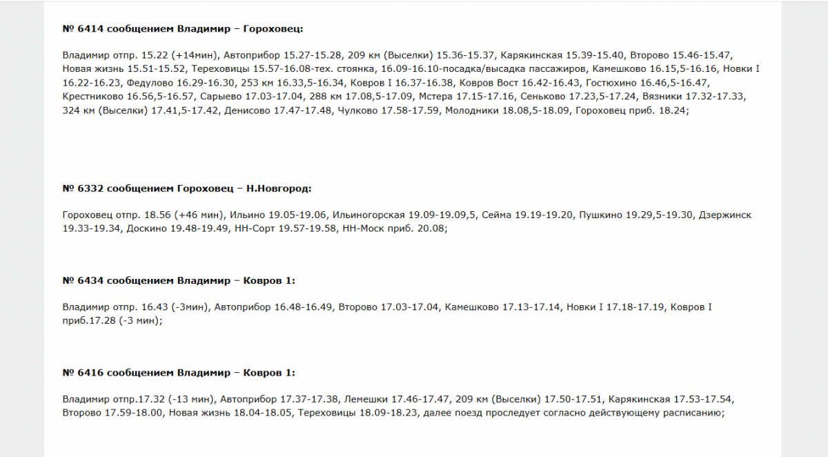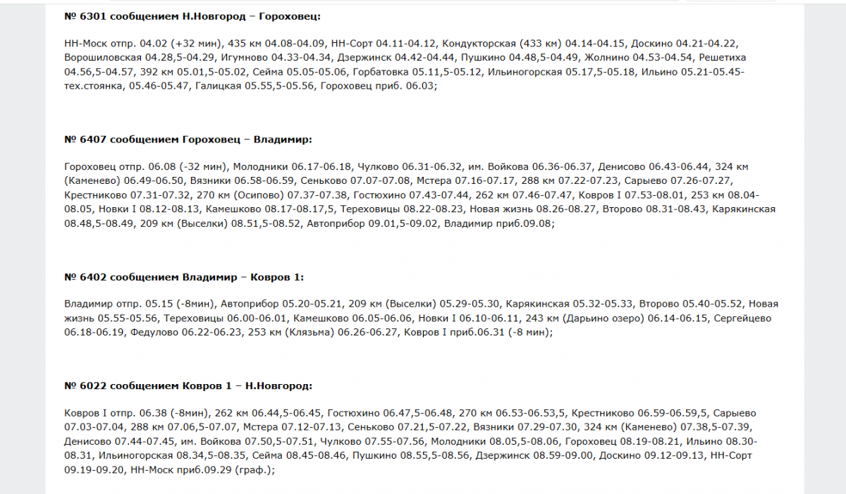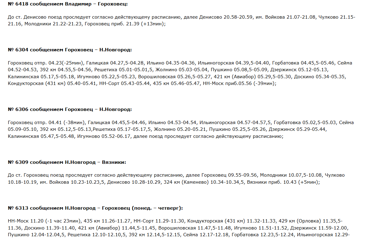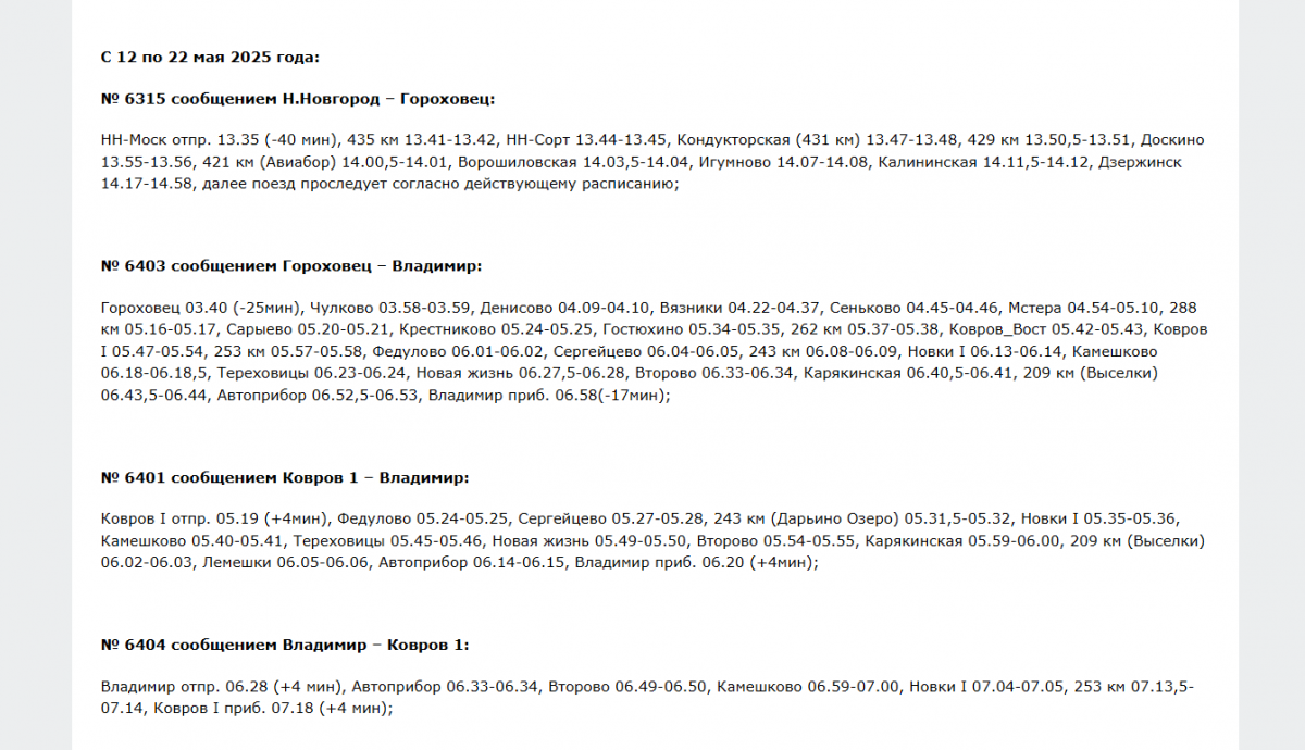Под новый график попадают и поезда № 6022 и № 6021 сообщением Ковров 1 — Н.Новгород и обратно, а также № № 6332, 6304 и 6306 Гороховец — Н.Новгород.