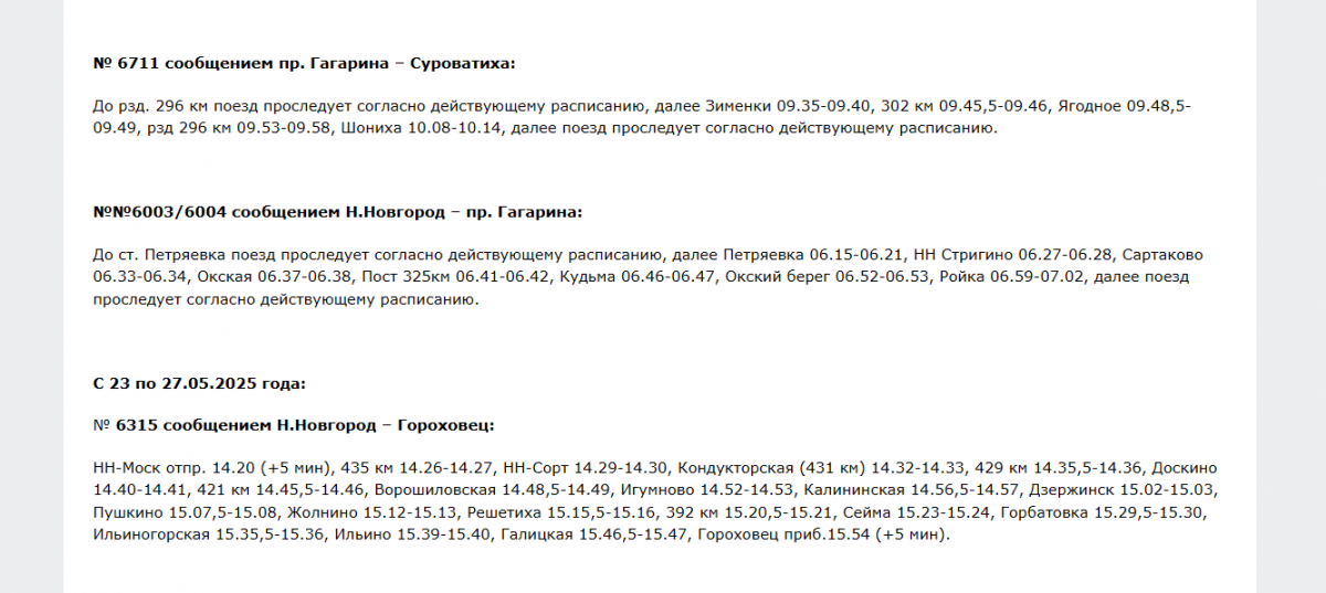 В частности, в период с 12 по 22 мая состав № 6315 сообщением Нижний Новгород — Гороховец будет отправляться в 13:35, а поезд № 6301 — в 04:02, который ходит по аналогичному маршруту.