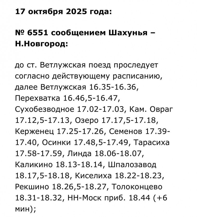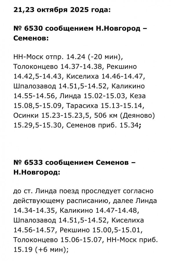 Кроме того, изменится расписание электричек Семеновского направления. Эти нововведения затронут пригородные поезда сообщением: «Шахунья — Нижний Новгород», «Нижний Новгород — Семенов», «Семенов — Нижний Новгород», «Нижний Новгород — Тарасиха». Они будут действовать 13, 17, 21 или 23 октября.