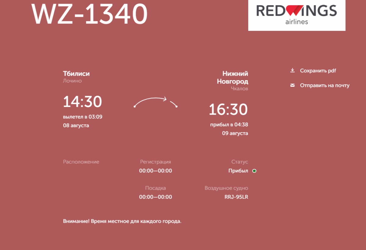 Самолет авиакомпании RedWings должен был вылететь из Тбилиси в 14:30 8 августа и прибыть в приволжскую столицу в 16:30 (по местному времени). Но по итогу рейс был отложен до 03:09 9 августа. Таким образом, воздушное судно приземлилось в Нижнем Новгороде только в 4:38.