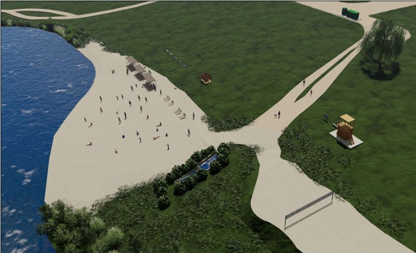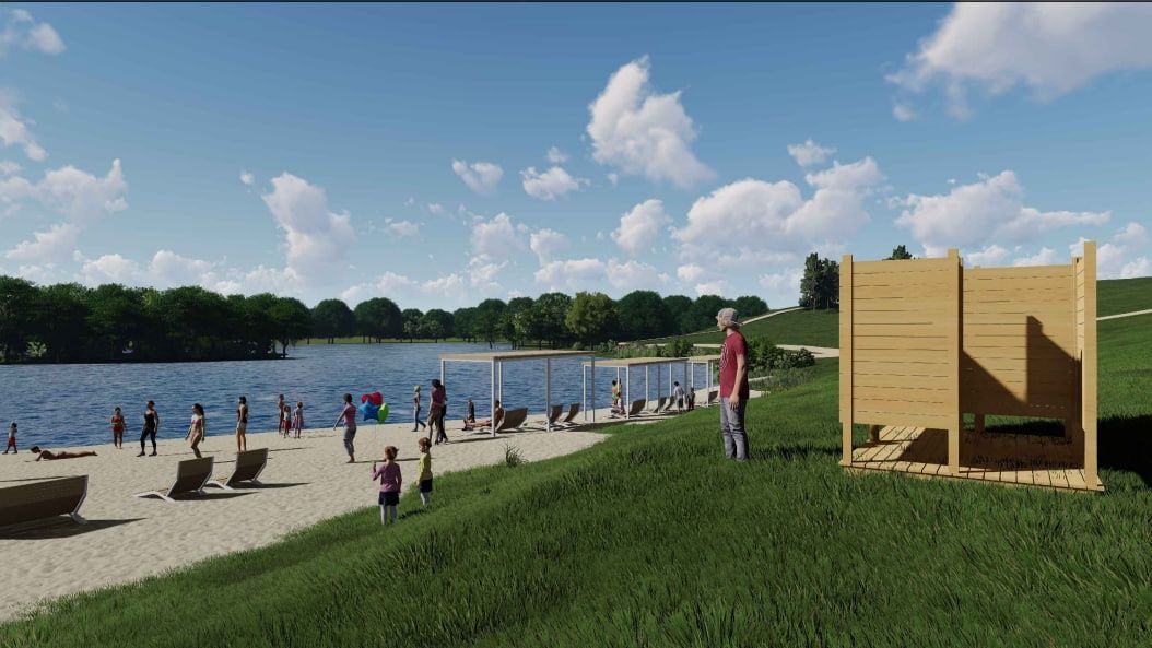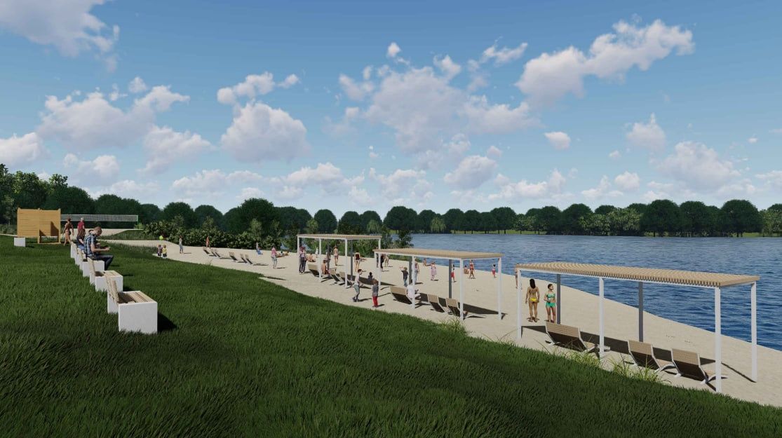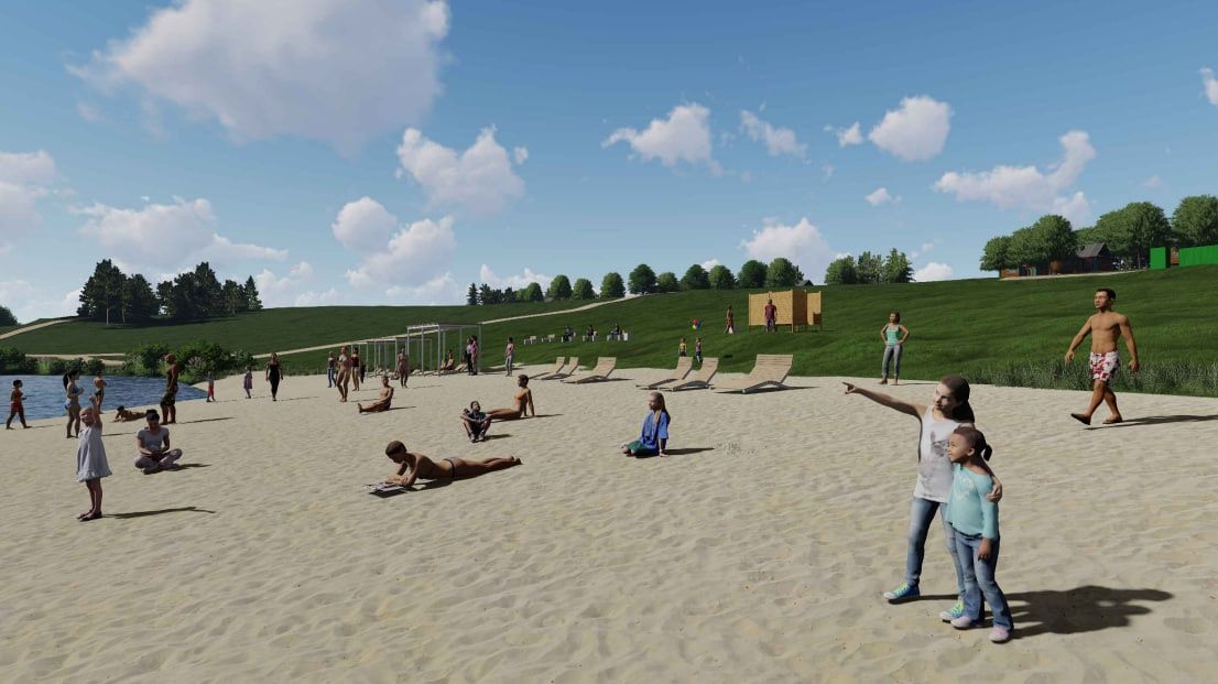 В прибрежной зоне появятся пляжная вышка на бетонированной площадке, навесы от солнца, шезлонги, скамьи, раздевалки, площадка для пляжного волейбола с песчаным покрытием, контейнерная площадка и туалетный модуль.