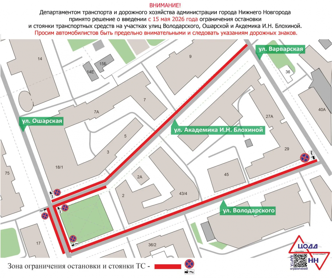 Для обеспечения беспрепятственно движения транспорта по объездным путям с 15 мая хотят ввести ограничения остановки и стоянки автомобилей на участках улицы Володарского и улицы Академика И. Н. Блохиной, а также в районе дома № 17 на улице Ошарской.