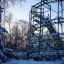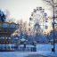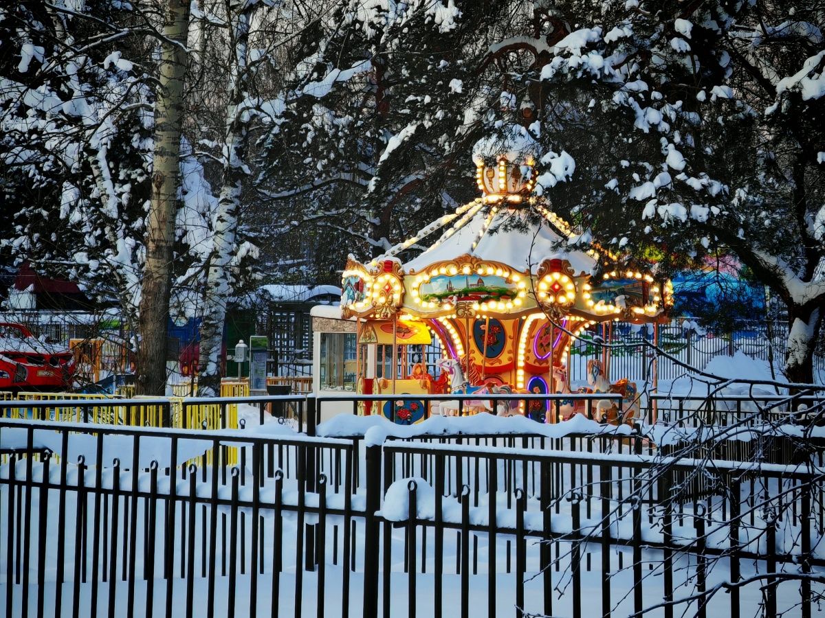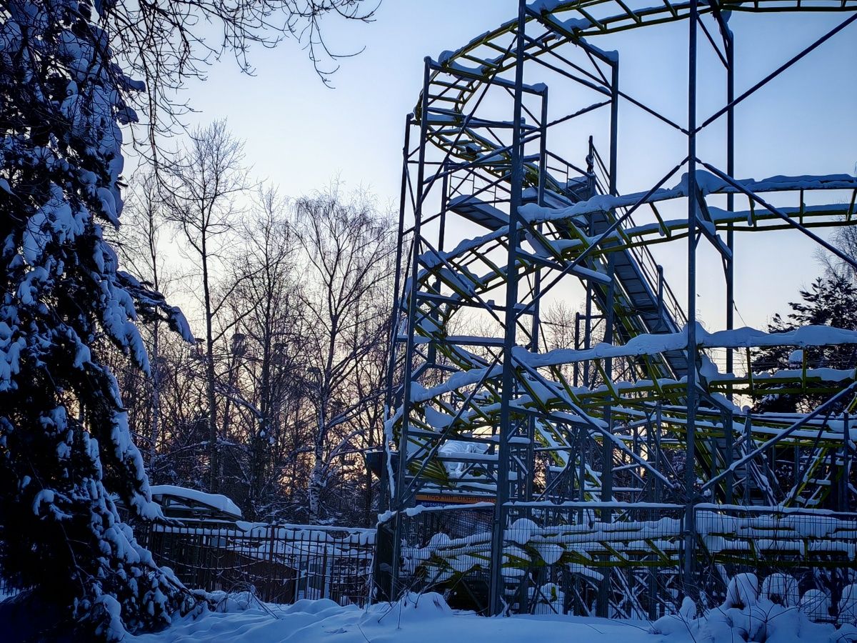 Наступает вечер. Жизнь потихоньку пробивается. Хотя и здесь погода все же берет свое. Многие аттракционы оказались замершими во времени. Колесо обозрение крутится, а вот американские горки засыпало снегом. Как и оборудование в местном веревочном парке.