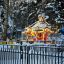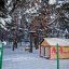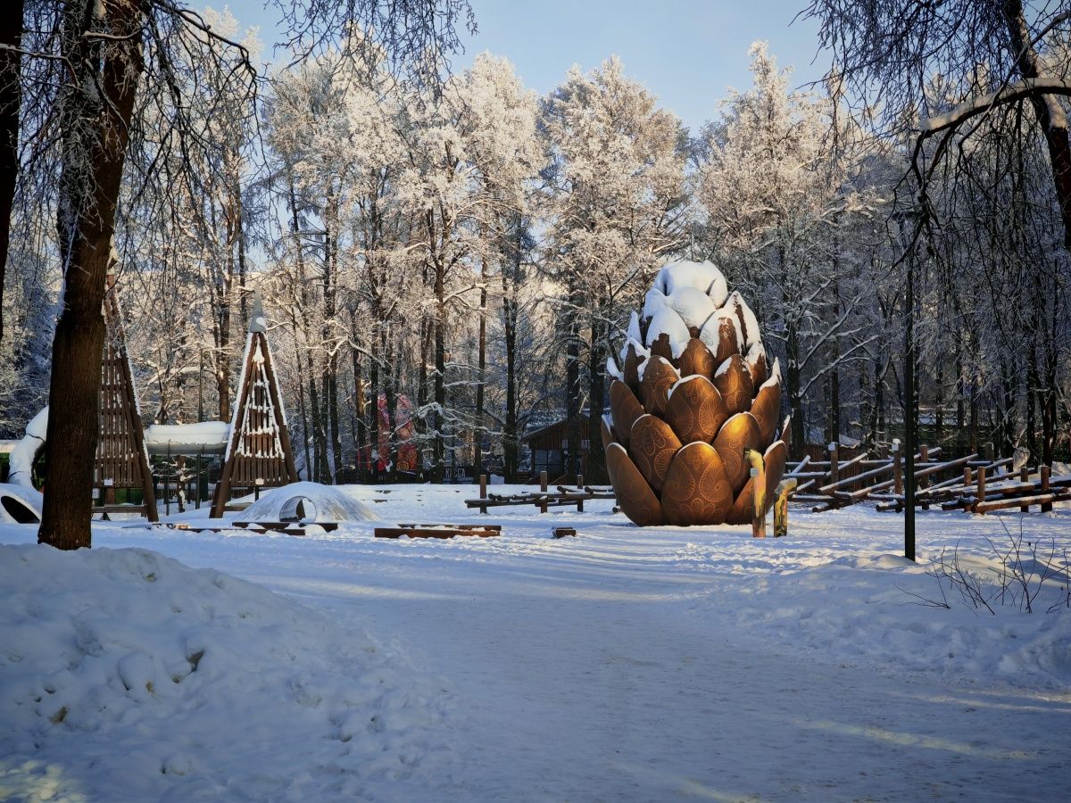 Побродила немного около входа. Детские площадки покрыты снегом, как и большая скульптура в виде шишки. На каждом «лепестке» — плотный белый слой.