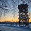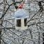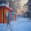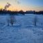 Посреди замерзшего пруда стоит припорошенный снегом домик для птиц. В желто-оранжевом небе заходящим солнцем подсвечивается дым из труб.