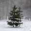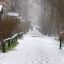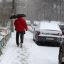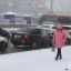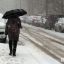 Немногочисленные прохожие пытаются укрыться от снега под зонтами. Однако это не очень помогает с учетом сильного ветра.