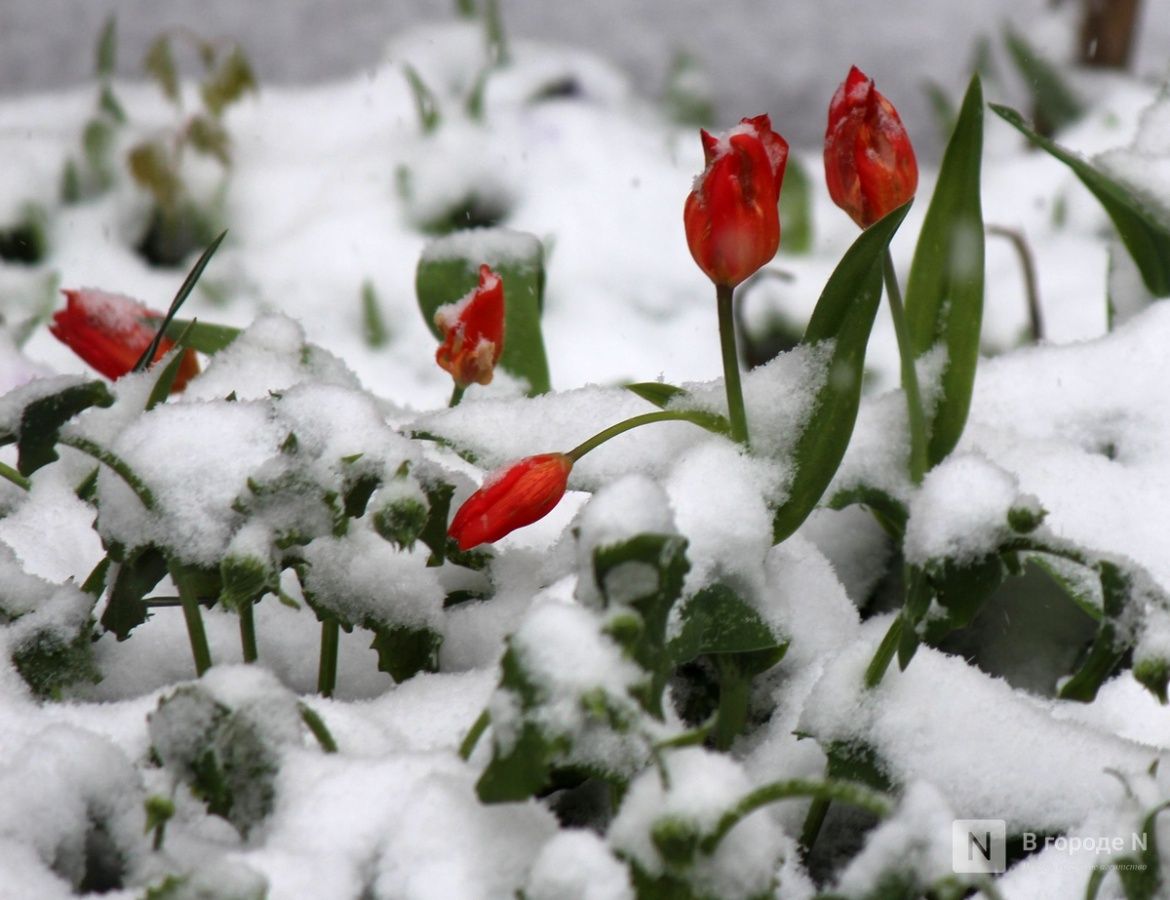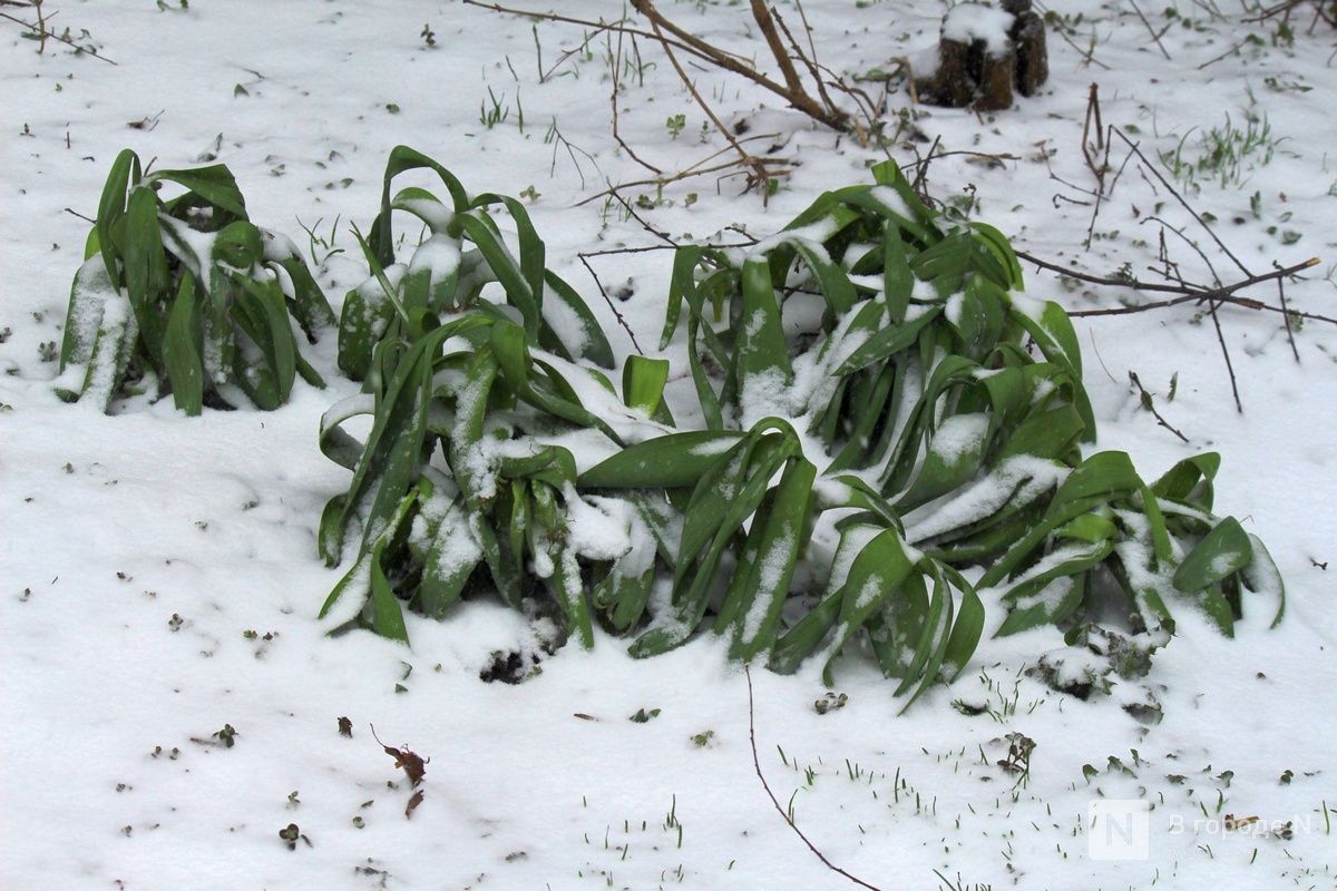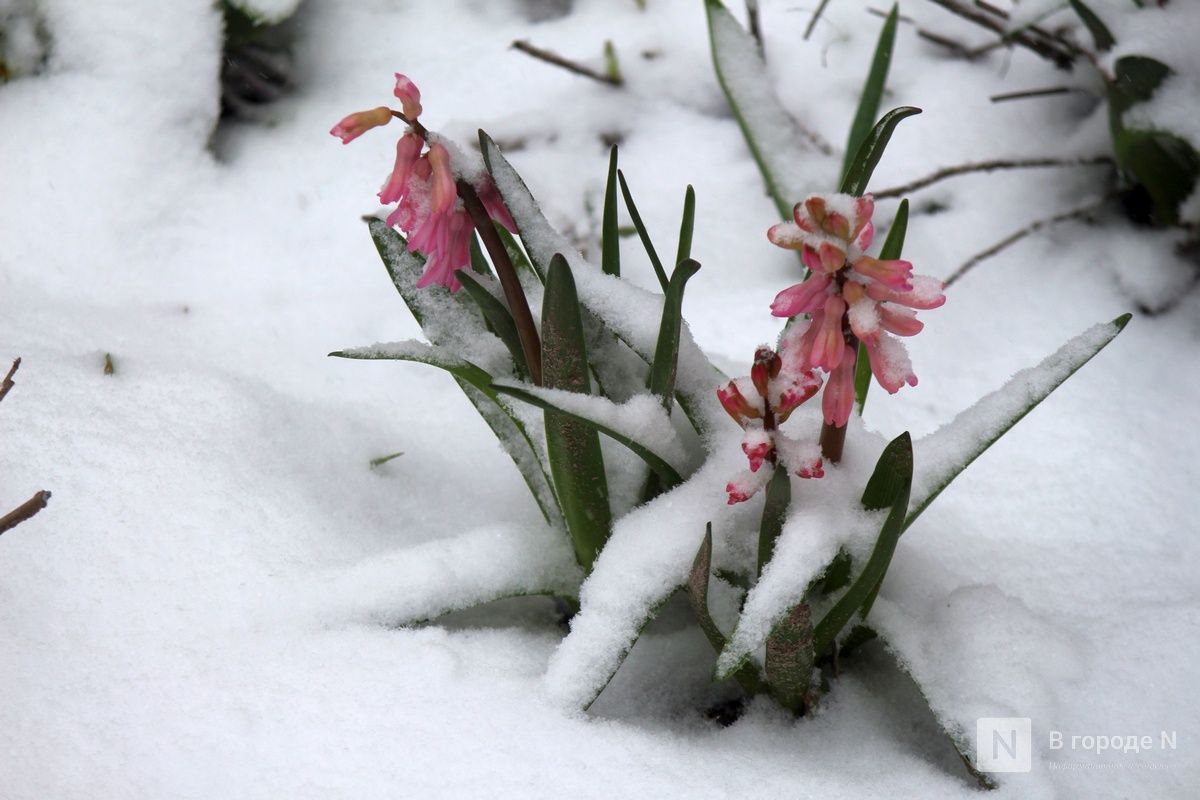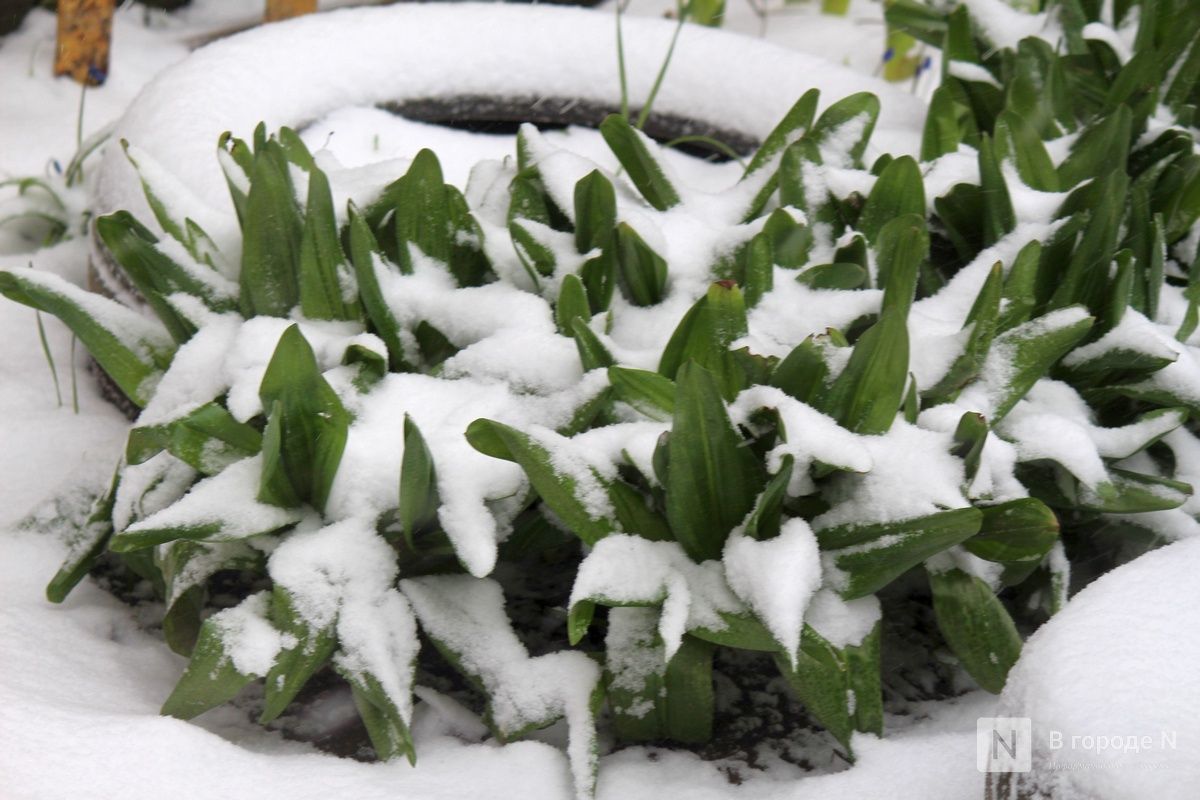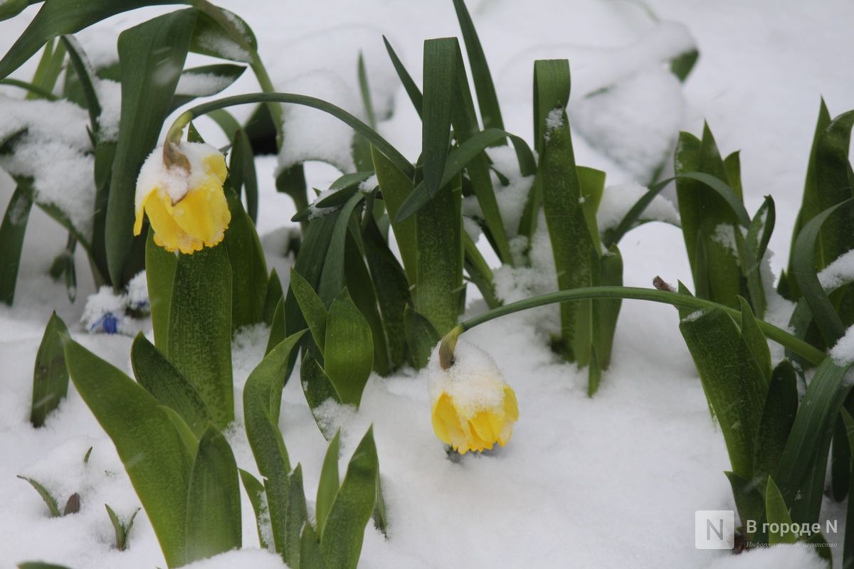 Первые цветы, которые распустились на клумбах и газонах, недолго радовали нижегородцев. Сейчас их постепенно заносит снегом. Выживут ли растения после такого — сложно сказать.