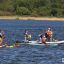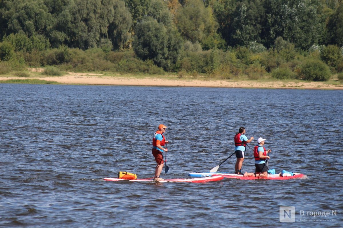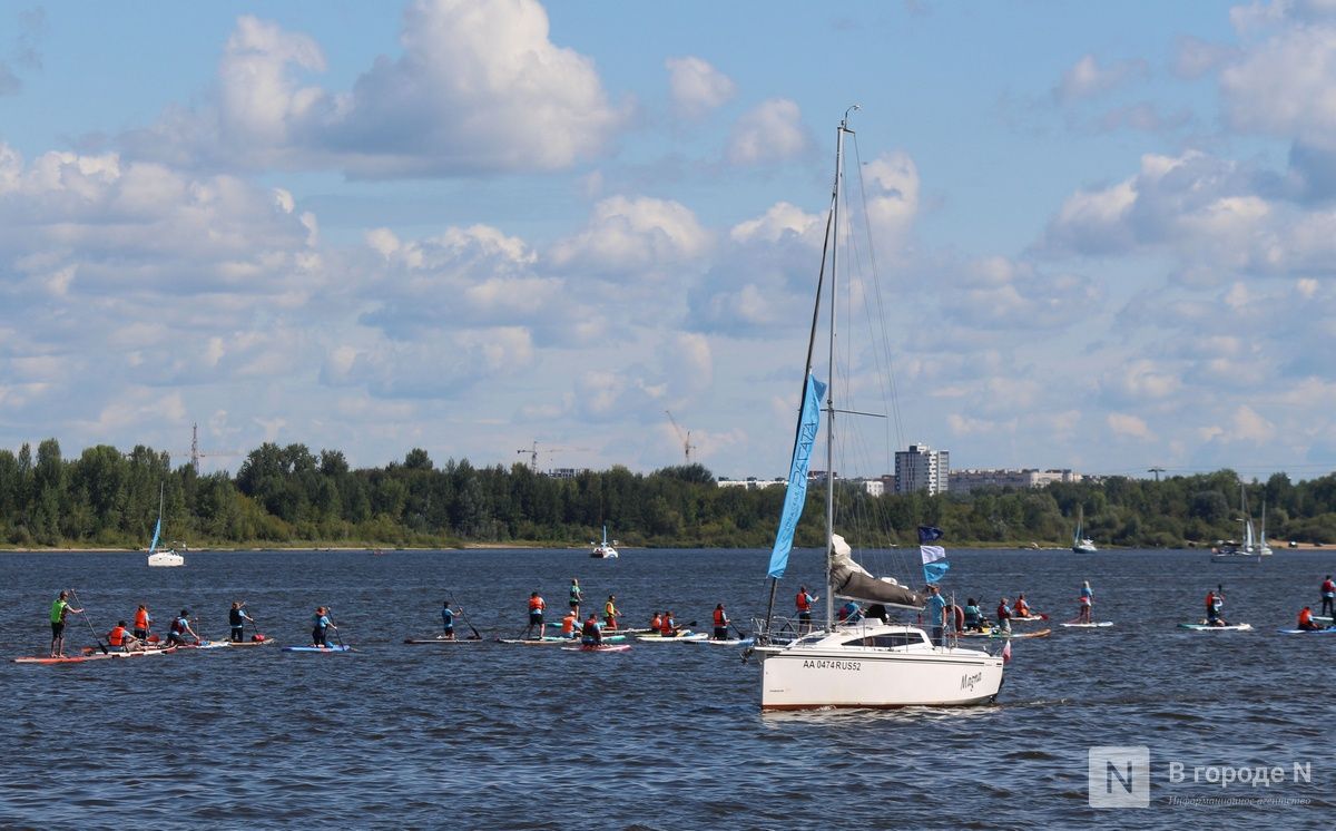 Затем на Волге начался сап-парад. Гребля на специальных досках в последние годы становится одним из самых популярных видов спорта, и желающих принять участие в шоу оказалось более 500. Разноцветные сапборды также выдвинулись со стороны Стрелки и проследовали до катера «Герой». Участники тоже прибыли из разных городов.