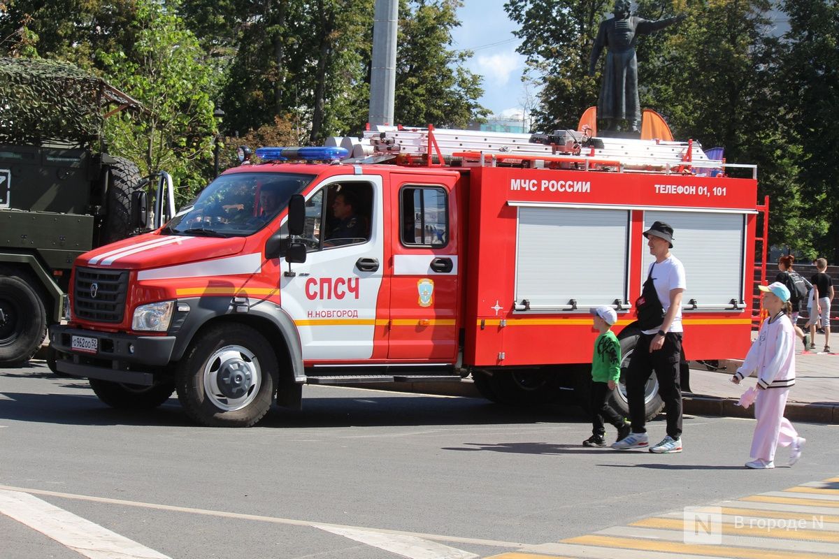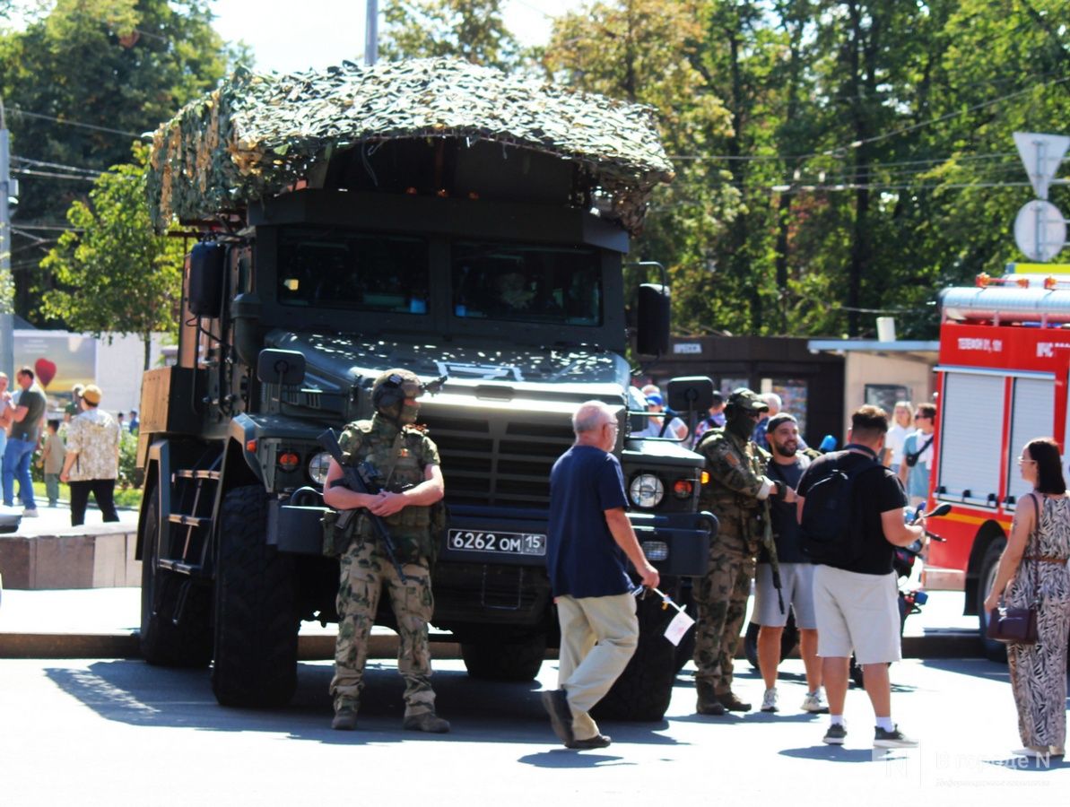 Кроме того, в текущем году отмечается 35-летие МЧС. Эта тема тоже нашла отражение в праздничных событиях. На площади Минина и Пожарского работала небольшая выставка техники, которая находится на службе у пожарных, полицейских и военных.