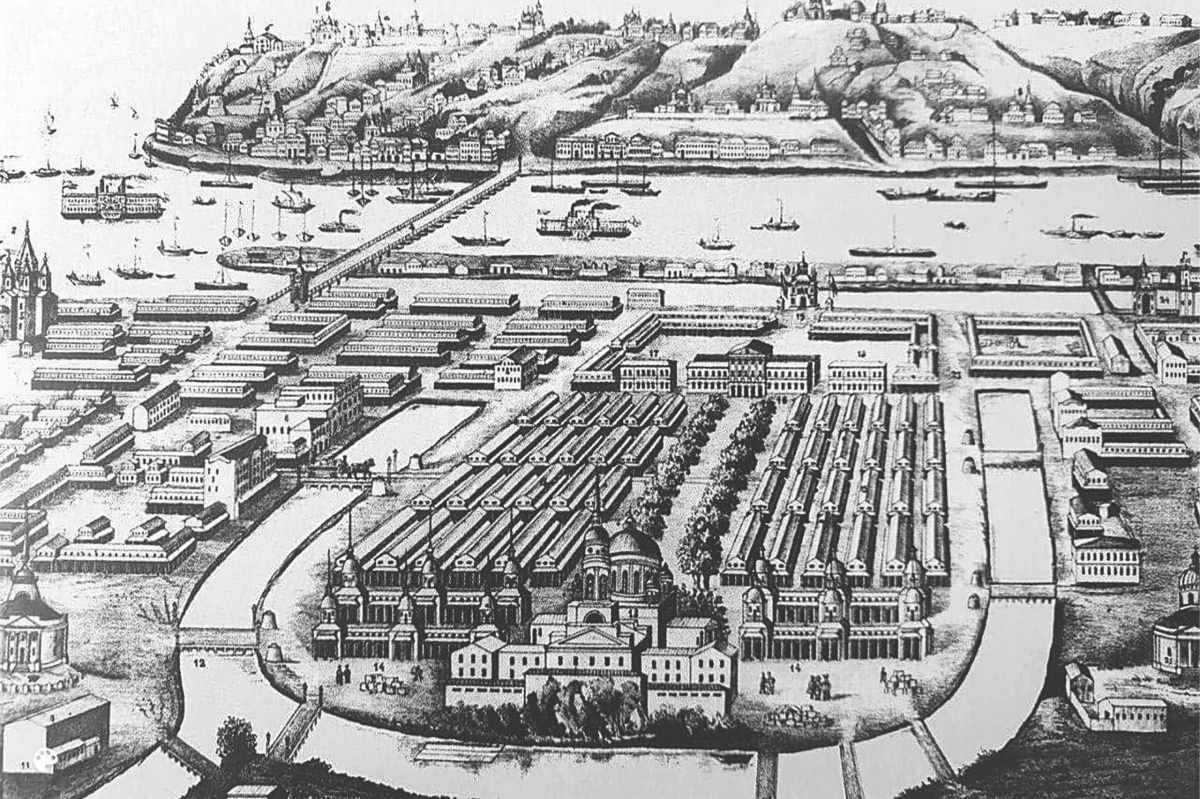 В 1816 году Макарьевскую ярмарку уничтожил пожар, и через год ее решили перенести в Кунавино, в котором на тот момент насчитывалось около 400 домов, но походило оно скорее на село. Понимая важность постройки нового экономического центра, император Александр I отложил перестройку Зимнего дворца, направив выделенные для этого деньги на постройку ярмарки. В 1822 году завершается строительство гостиного двора, спроектированного Августином Бетанкуром.