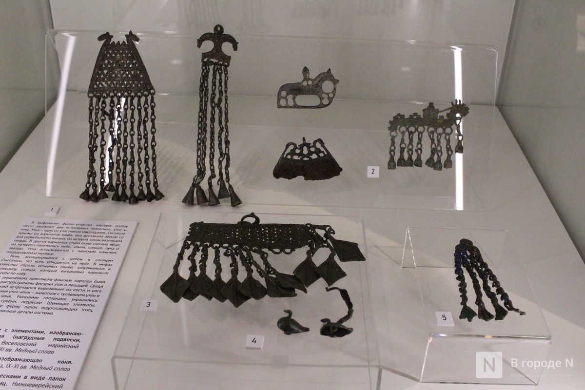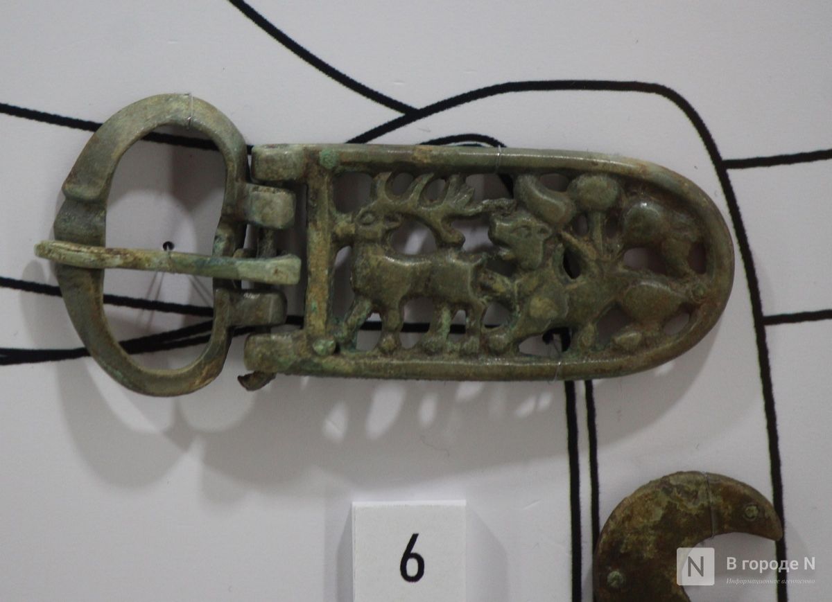 Поскольку женщин племени мурома хоронили с богатым набором украшений, немалую часть экспозиции составляют всевозможные браслеты, кольца, височные подвески, ожерелья из монет и так далее. А одной из самых запоминающихся находок Юрий Филиппов назвал металлическую пряжку с изображением оленя, которая когда-то украшала мужской костюм. Она также была обнаружена при исследовании Звягинского могильника и относится к VIII веку.