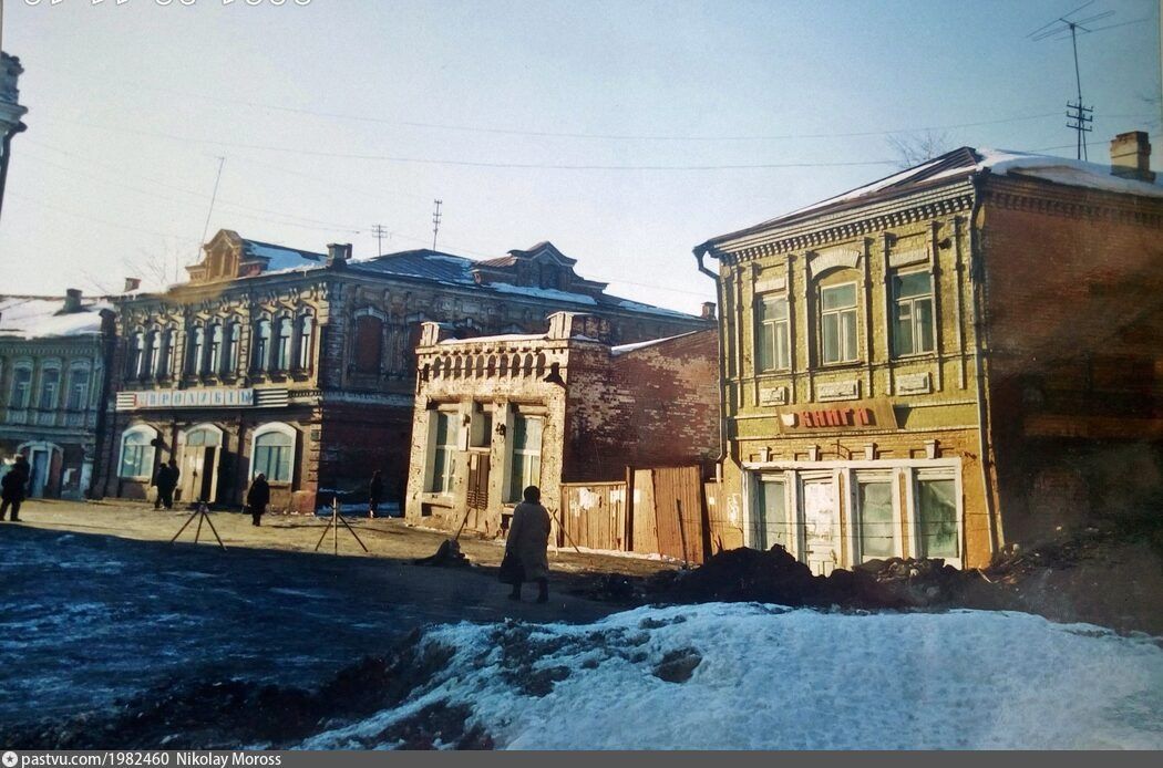 Дома, покосившиеся от карстового провала на Нижегородской улице, 1996 / pastvu.com; Нижегородская улица. Журнал "Смена" №6, 1991 / pastvu.com